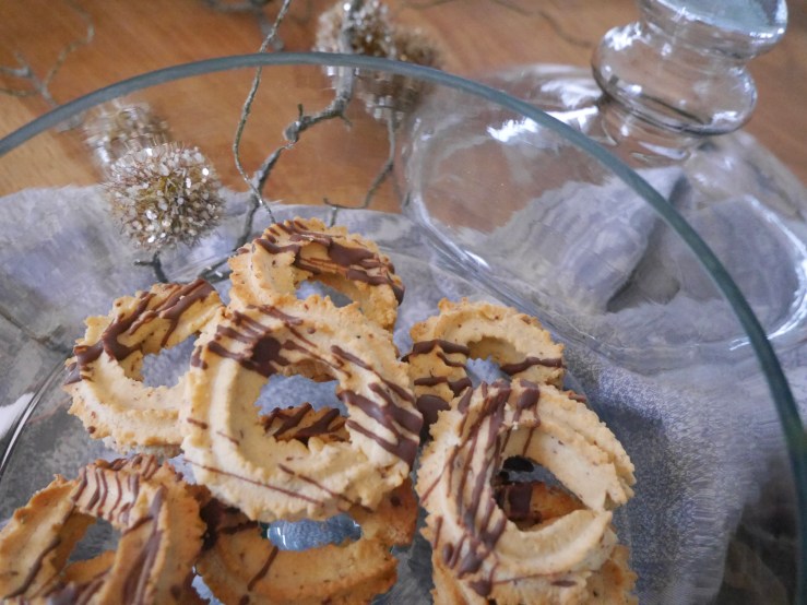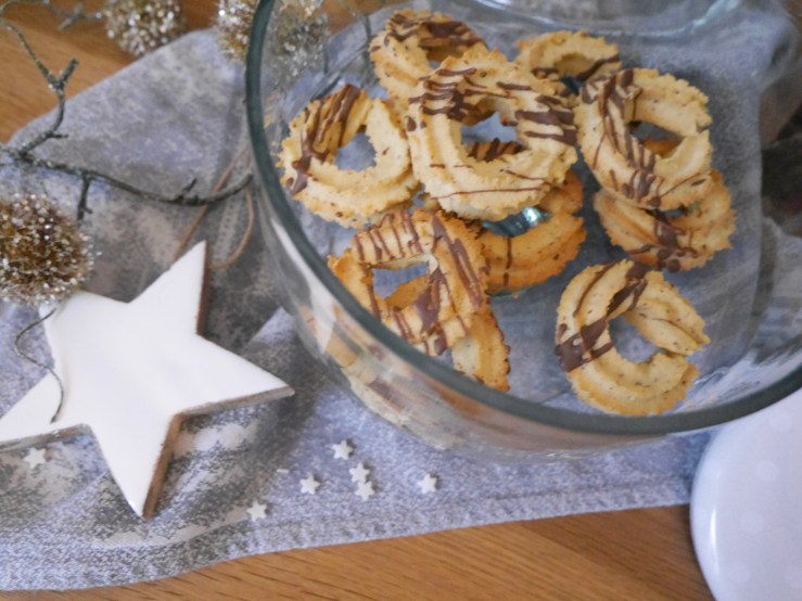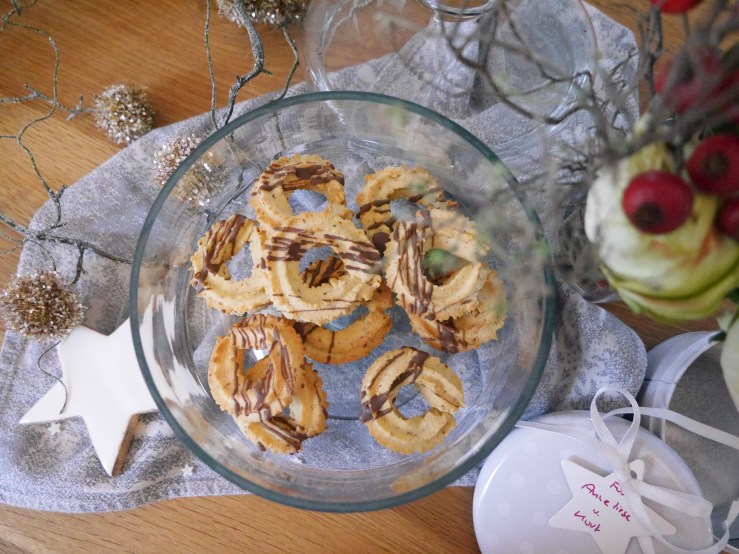 Mit Hilfe eines stabilen Spitzbeutels oder einer Küchenmaschine ( z.B. Kitchen Aid mit Spritzgebäck-Aufsatz) 40 kleine Kränze auf eine mit Backpapier belegtes Blech spritzen.