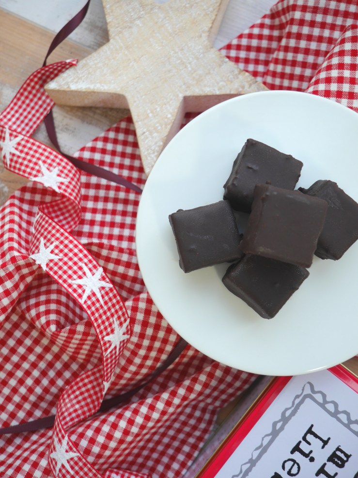 Zum Schluss jeden Würfel mit der Kuvertüre vollständig überziehen. Trocknen lassen.