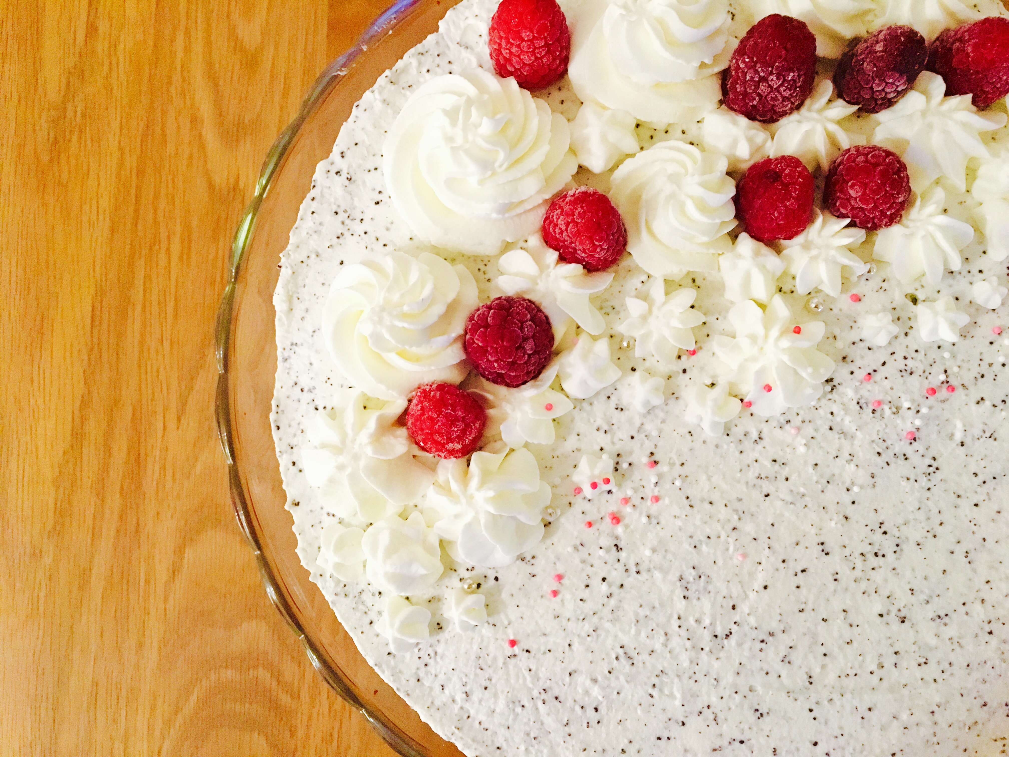 Mit dem Spritzbeutel die Sahne dekorativ auf die Torte spritzen und mit den Himbeeren verzieren. 1 Stunde kühlen bis die Torte fest ist.