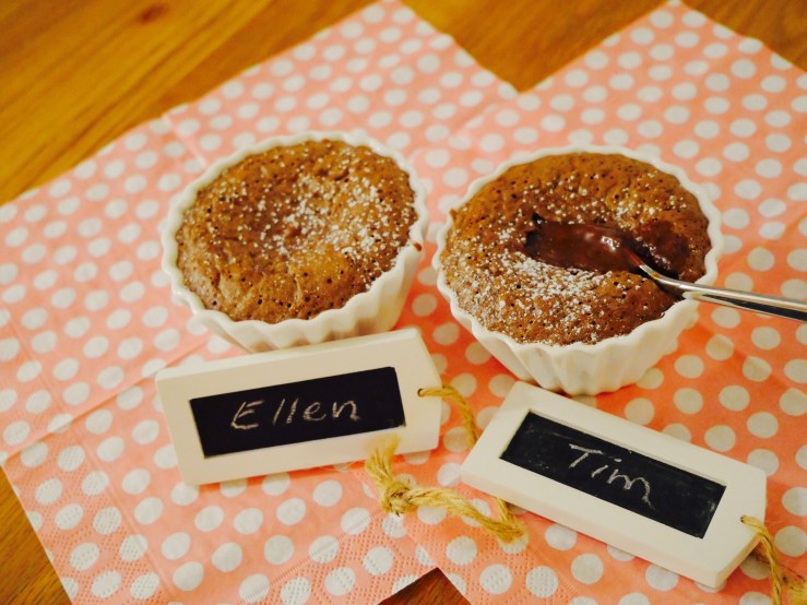 Die feuerfesten Förmchen mit Butter ausfetten und mit etwas Mehl bestäuben. Den Teig in die Förmchen füllen und im vorgeheizten Backofen bei 180 Grad Umluft 10 Minuten backen. Etwas abkühlen lassen.