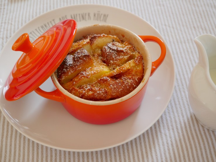 4 kleine Auflaufformen oder feuerfeste Formen leicht buttern und abwechselnd die Hefeteigscheiben und die Äpfel schichten. Die übrige Eier-Milch darüber gießen.