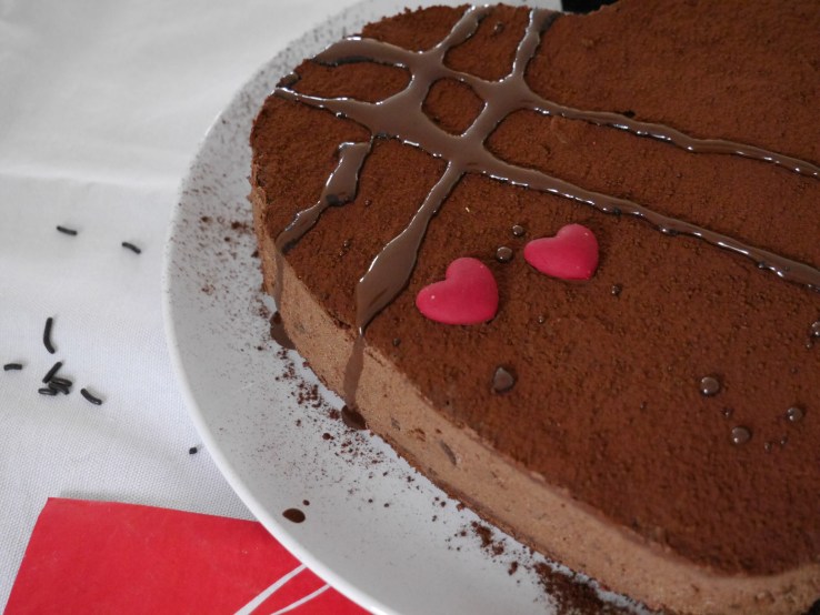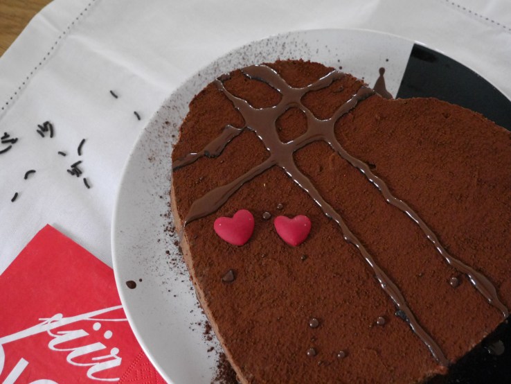 Die Schokoladensahne mit dem Rührgerät zu einer festen Mousse aufschlagen und knapp die Hälfte der Mousse auf den unteren Herzboden streichen. Den zweiten Boden darauflegen, vorsichtig andrücken und bis auf 3 EL die restliche Mousse darauf verteilen. Nun den letzten Boden darauflegen, andrücken und mit der übrig gebliebenen Mousse die Oberfläche nun glätten. Das fertige Herz für 1 Stunde kühlen.