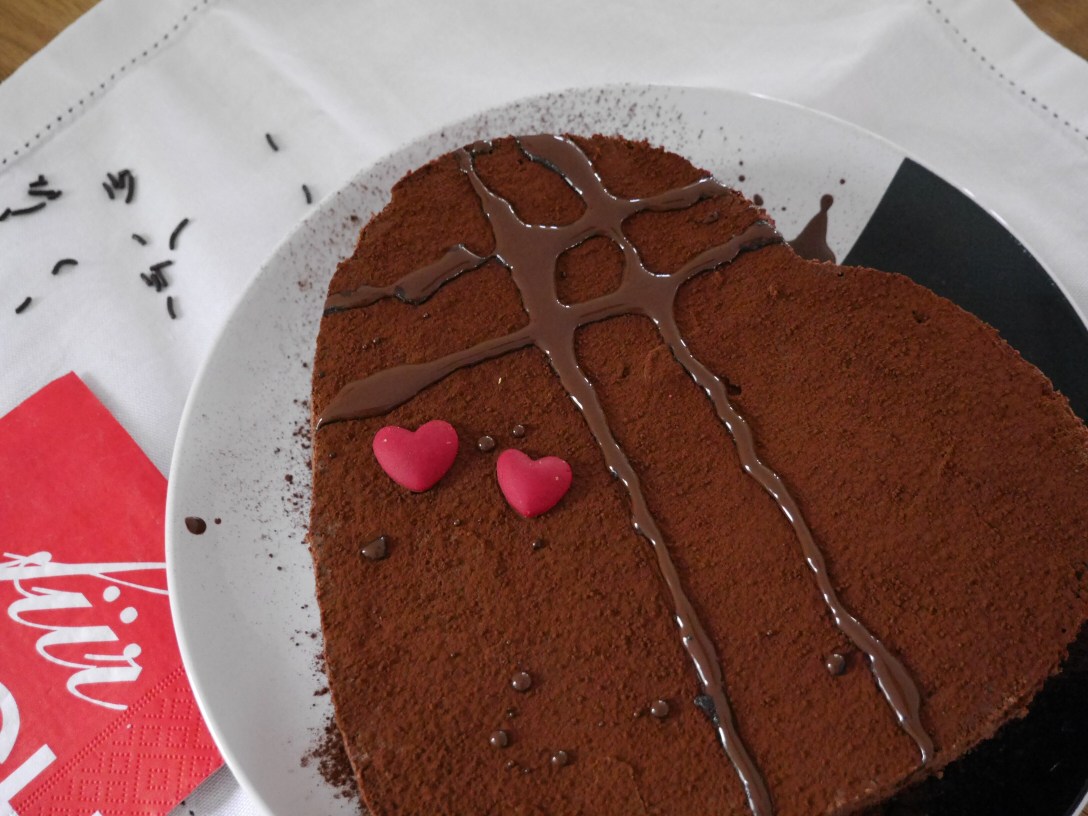 Die Schokoladensahne mit dem Rührgerät zu einer festen Mousse aufschlagen und knapp die Hälfte der Mousse auf den unteren Herzboden streichen. Den zweiten Boden darauflegen, vorsichtig andrücken und bis auf 3 EL die restliche Mousse darauf verteilen. Nun den letzten Boden darauflegen, andrücken und mit der übrig gebliebenen Mousse die Oberfläche nun glätten. Das fertige Herz für 1 Stunde kühlen.