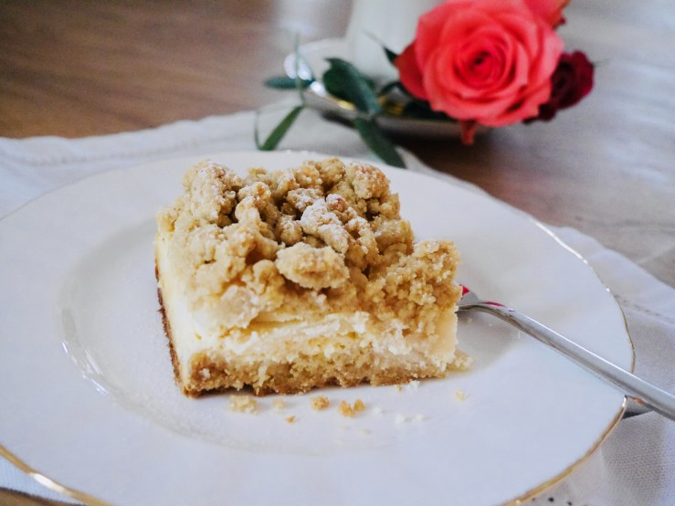 Den Frischkäse mit dem Zucker, den Eiern und der Zitronenschale glattrühren und ebenfalls auf dem Kuchen verteilen. Die Streusel darüber streuen und erneut 35 Minuten backen.