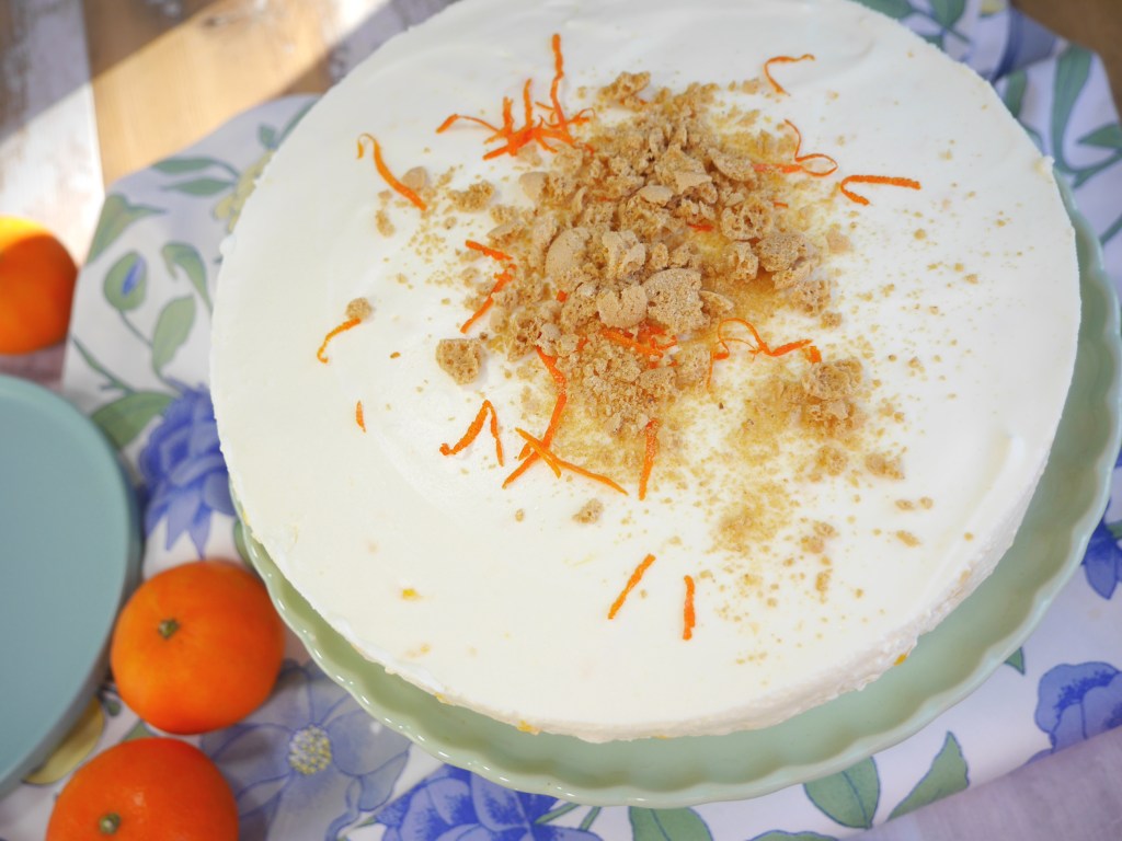3. Für die Deko den Kuchen mit den Kekskrümeln und dem Fruchtabrieb dekorieren.