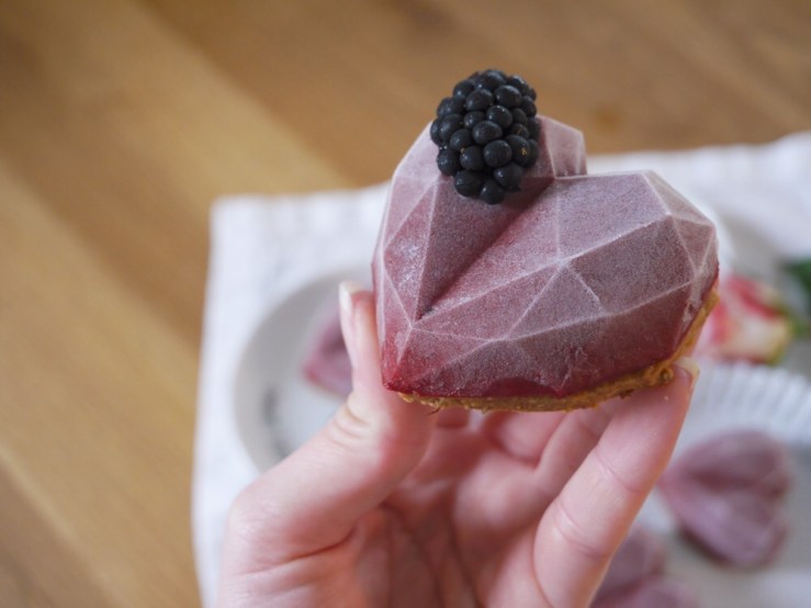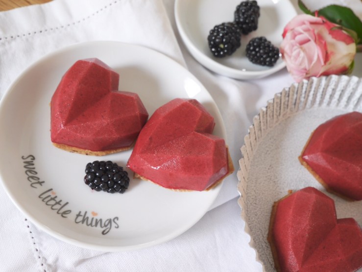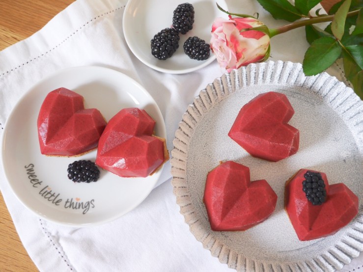 3. Für die Deko die Herzen aus den Formen lösen, jeweils mit etwas Gelee oder Marmelade auf ein Mürbeteigherz kleben und ca. 15 Minuten Zimmertemperatur antauen lassen. Zum Abschluss die frischen Brombeeren halbieren und die Herzen damit dekorieren.