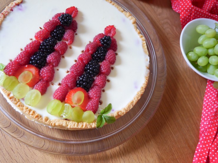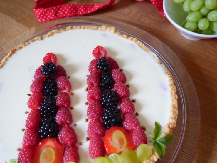 4. Für die Deko das Obst waschen und die Tarte damit verzieren. Die Kuvertüre über dem Wasserbad schmelzen und mit einem Zahnstocher die Tarte dekorieren.