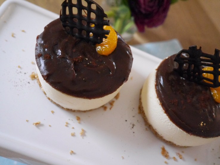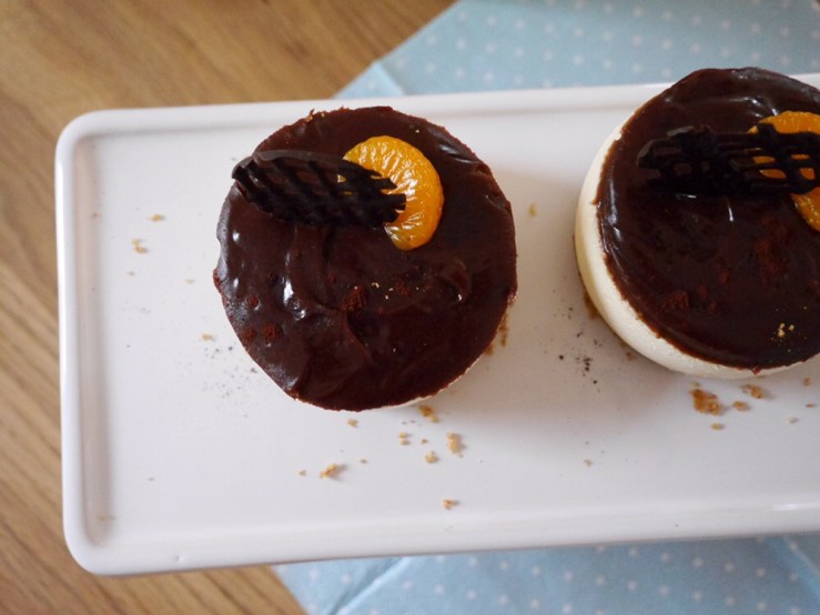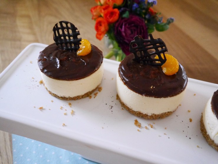 3. Für die Deko den Nougat zusammen mit der Nussnougatcreme langsam schmelzen. Den Topf vom Herd nehmen, kurz abkühlen lassen und den Schmand unterrühren. Die Nusscreme auf den Törtchen verteilen und jeweils mit einer Mandarine und etwas Kakao nach Lust und Laune verzieren.