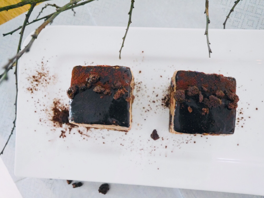 Zum Abschluss vorsichtig die Schokoladenglasur auf der obersten Schicht verteilen, sodass sie gleichmäßig dünn ist. Kurz (ca. 5 Minuten) kühlen.