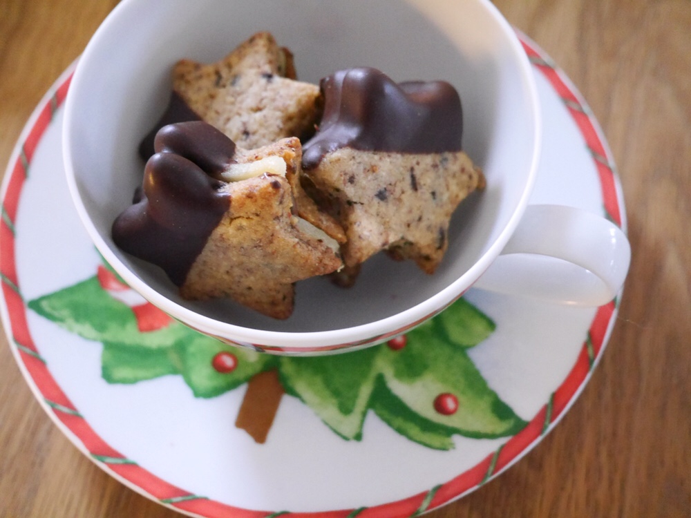 3. Für die Deko die Kuvertüre im Wasserbad schmelzen und jeden Stern mit zwei Zacken hineintunken. Abtropfen und erstarren lassen.