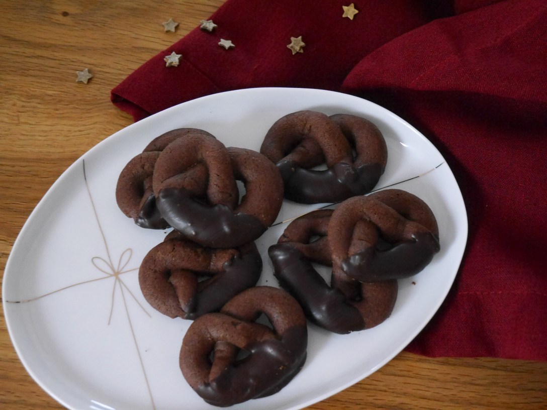2. Für die Deko die Kuvertüre im Wasserbad schmelzen und die Schokoladenbrezeln zur Hälfte eintunken. Auf einem Gitter abtropfen und erstarren lassen.