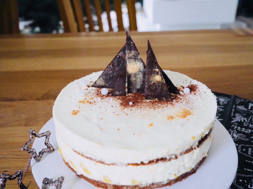 Die restlichen Zutaten (außer der Bittermilch) mischen und mit der Küchenmaschine verrühren. Die Buttermilch nun dazugeben und den Honigsirup langsam zufügen. Sobald ein glatter Teig entstanden ist eine Springform (18 cm) Durchmesser fetten, mit Backpapier auslegen und den Teig einfüllen. Den Kuchen bei 180 Grad Umluft im vorgeheizten Backofen ca. 45 Minuten backen. Abkühlen lassen und den Kuchen in der Mitte halbieren (ggf. die Oberseite etwas begradigen). Die obere Kuchenhälfte mit der begradigten Seite nach Oben in einen Tortenring legen und fest umschließen.