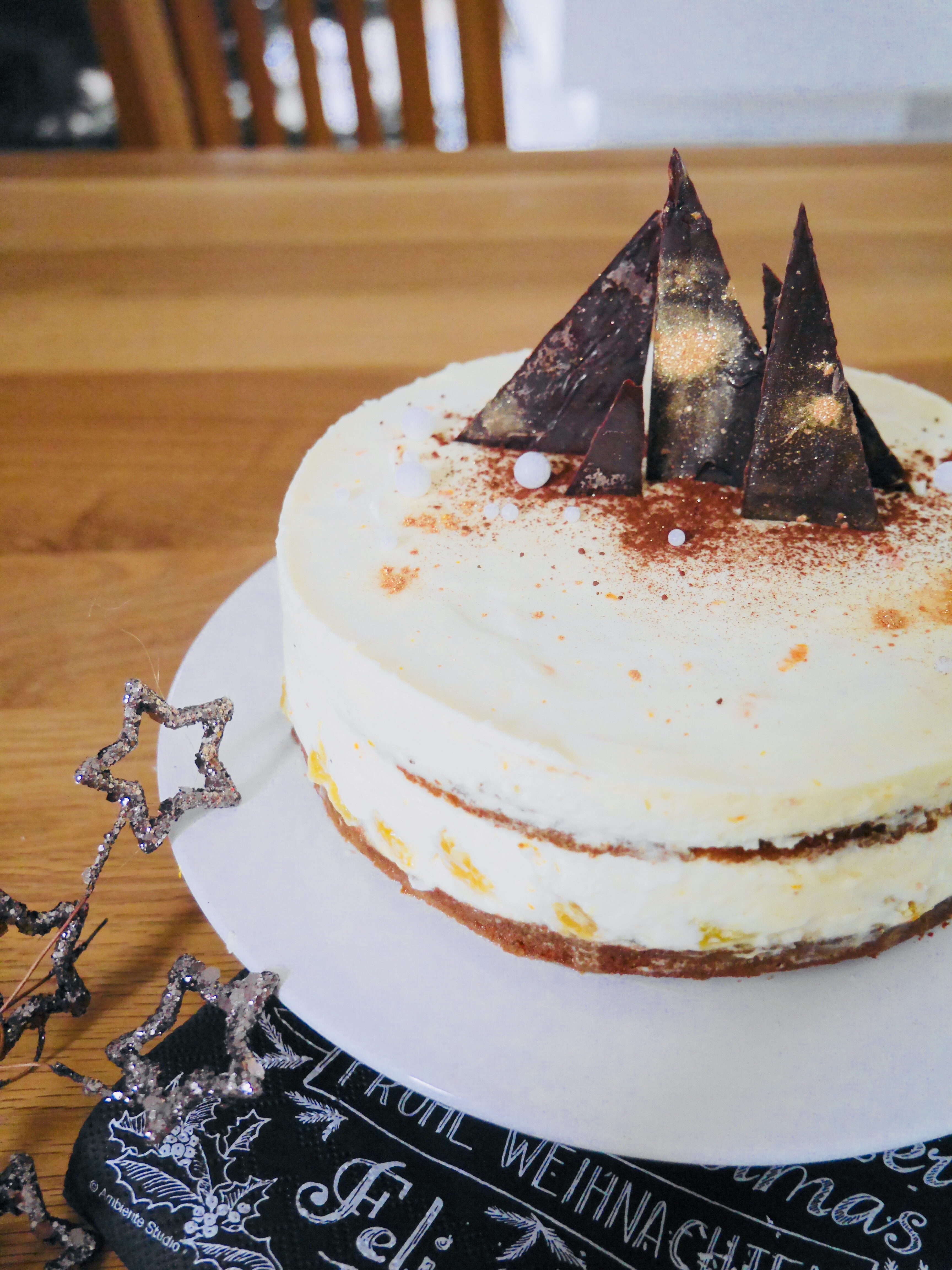 Marmelade erhitzen, durch ein Sieb streichen und auf der Kuvertüreschicht verteilen. Die restliche Creme auf der Oberseite glatt streichen und die Torte mit etwas Kakao, Schokoladendekor und ggf. Goldstaub nach Belieben dekorieren.