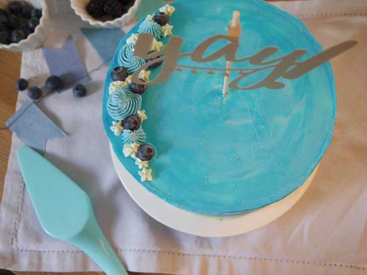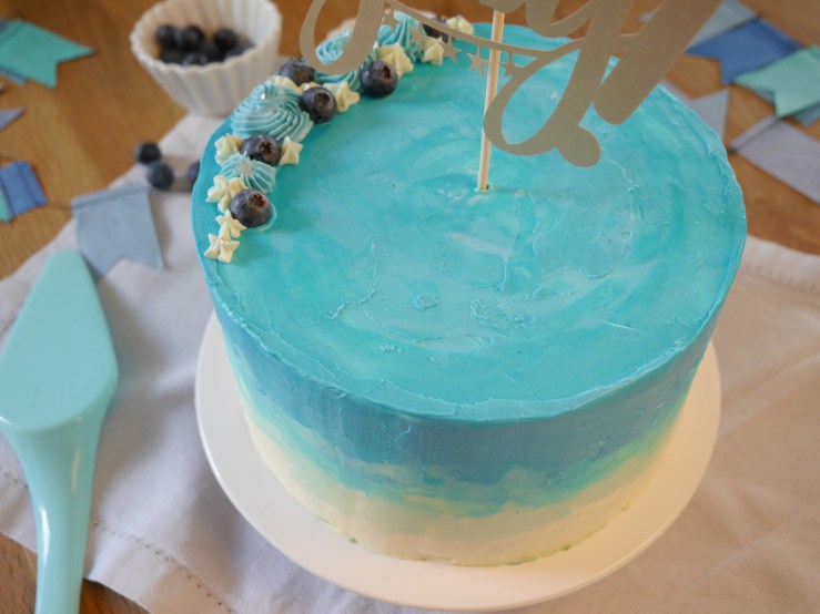 Zuerst mit der weißen Creme mit Hilfe einer Palette einen handbreiten Streifen von unten auf die Torte streichen. Den Vorgang mit den beiden blauen Cremes wiederholen, sodass ein farbverlauf entsteht. Abschließend mit einer Palette die Torte nocheinmal glattstreichen und die Oberseite ebenfalls bestreichen.
