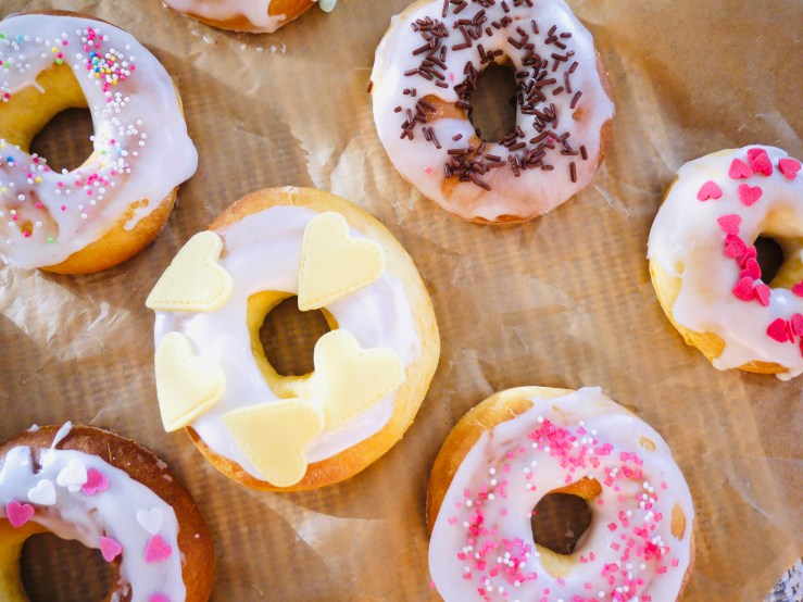 Den aufgegangenen Teig auf einer bemehlten Arbeitsfläche 1,5-2 cm dick ausrollen und mit Hilfe eines Donut-Ausstechers oder zwei verschieden großen Gläsern Donuts mit einem Durchmesser von ca. 8 cm ausstechen. Die Donuts auf ein mit Backpapier belegtes Blech legen, mit dem Handtuch abdecken und erneut 15 Minuten an einem warmen Ort gehen lassen.
