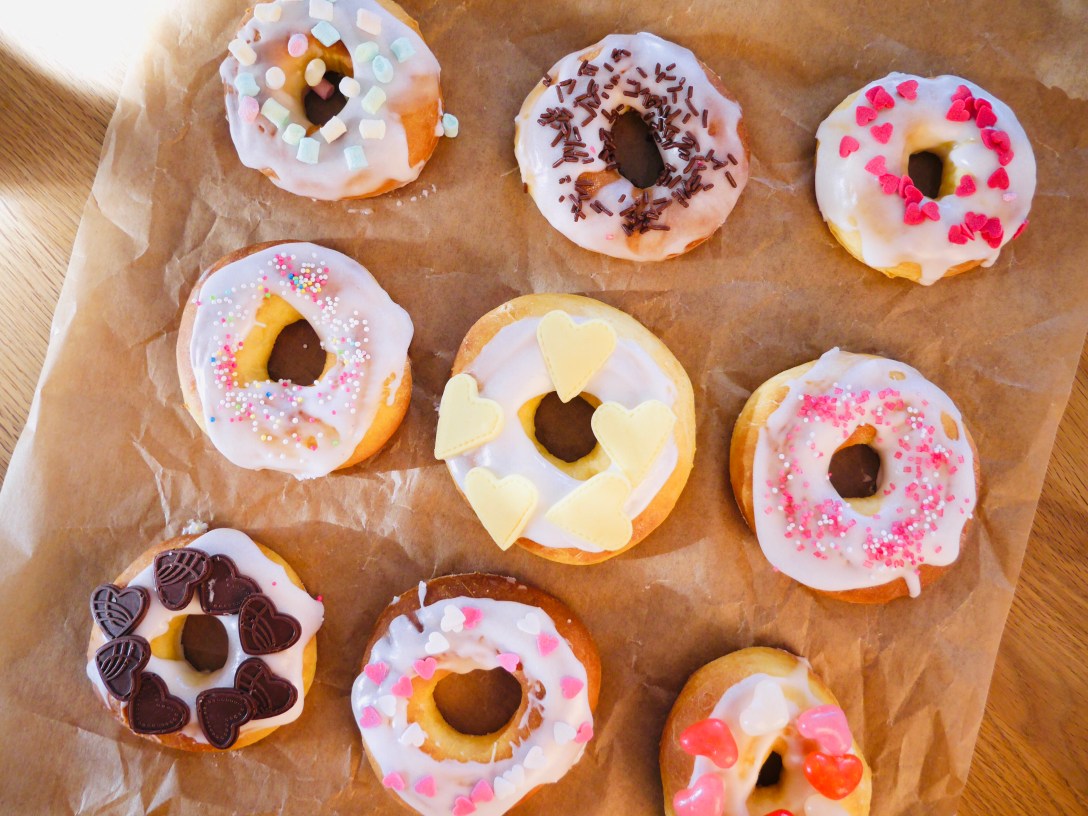 Den Backofen auf 150 Grad Umluft vorheizen und die Donuts 12-15 Minuten zart goldgelb ausbacken und abkühlen lassen.