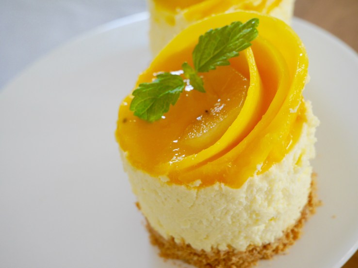 Die Törtchen aus den Servierringen lösen, mit dem Püree bestreichen und den Mangoscheiben dekorieren.