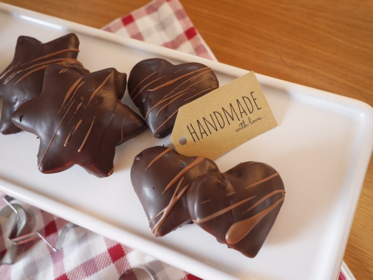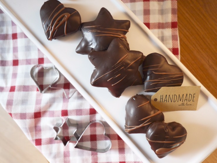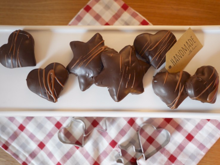 3. Für die dunkle Kuchenglasur den Guss im Wasserbad erhitzen und die Lebkuchen damit komplett umhüllen, auf ein Abtropfgitter legen und abkühlen lassen.