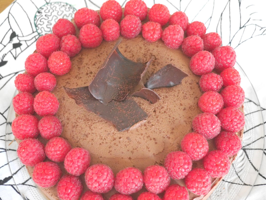 Abschließend mit den frischen Himbeeren und Schokoldendekor verzieren.
