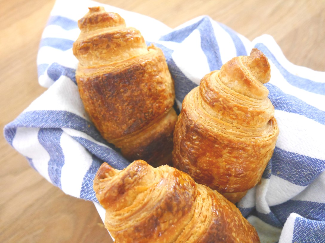 3. Für die Deko den Backofen auf 210 Grad Ober-/Unterhitze vorheizen. In der Zwischenzeit das Ei mit der Milch gut verquirlen und die Croissants damit bestreichen. Anschließend jedes Backblech einzeln 18 Minuten backen und abschließend die Temperatur auf 190 Grad drosseln und weitere 6 Minuten goldgelb backen. Den Backofen ausschalten und die Croissants noch min. 5 darin langsam abkühlen lassen.