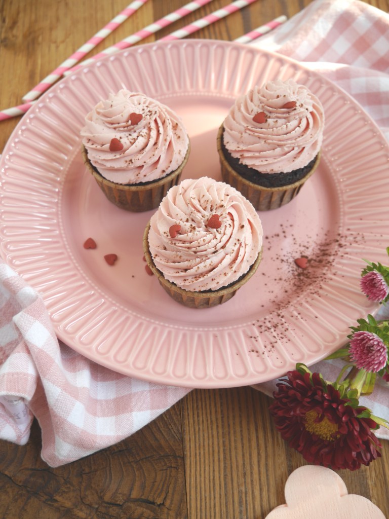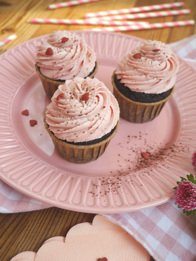 3. Für die Deko die Cupcakes liebevoll mit den Zuckerherzen und dem Backkakao dekorieren.