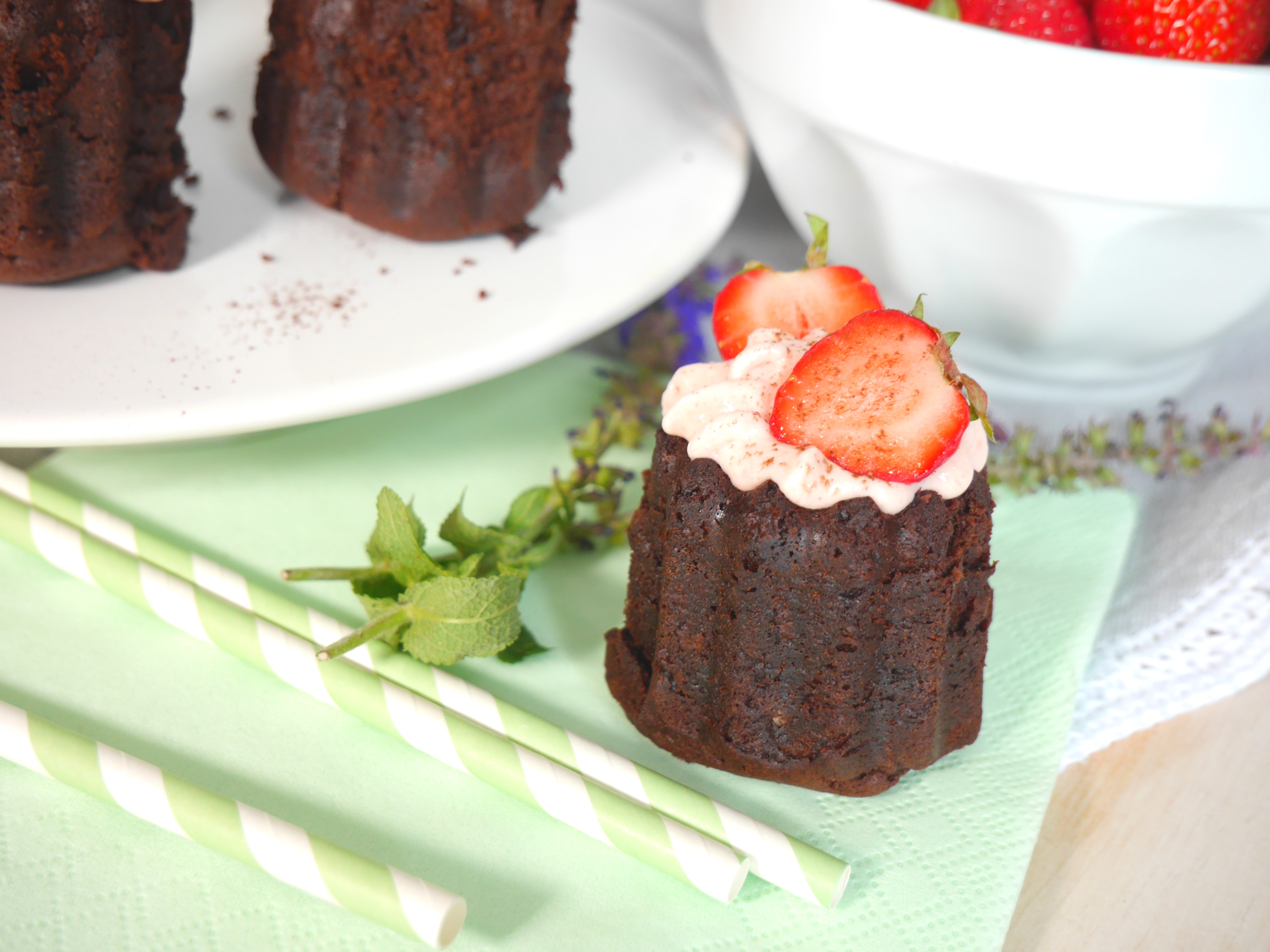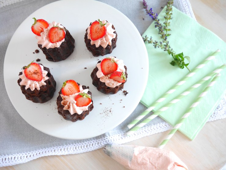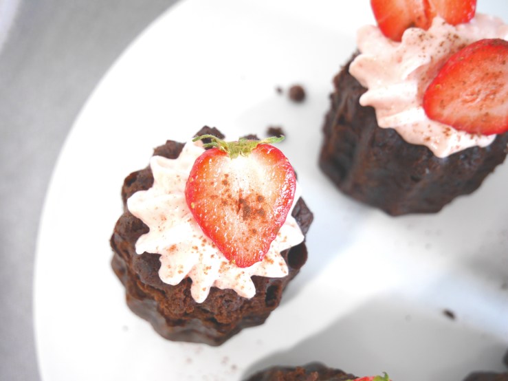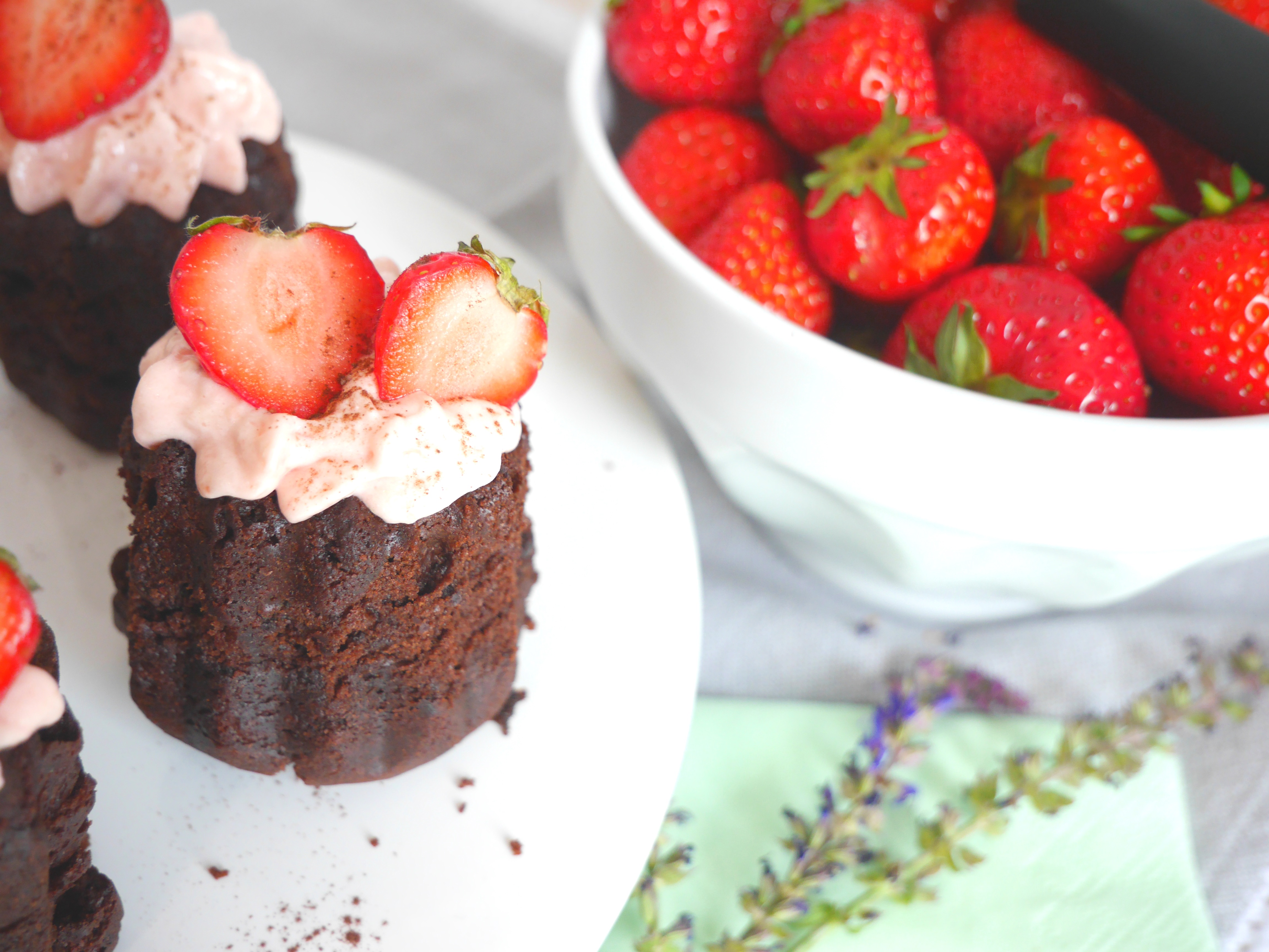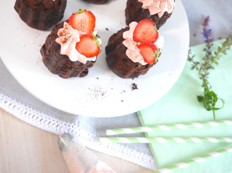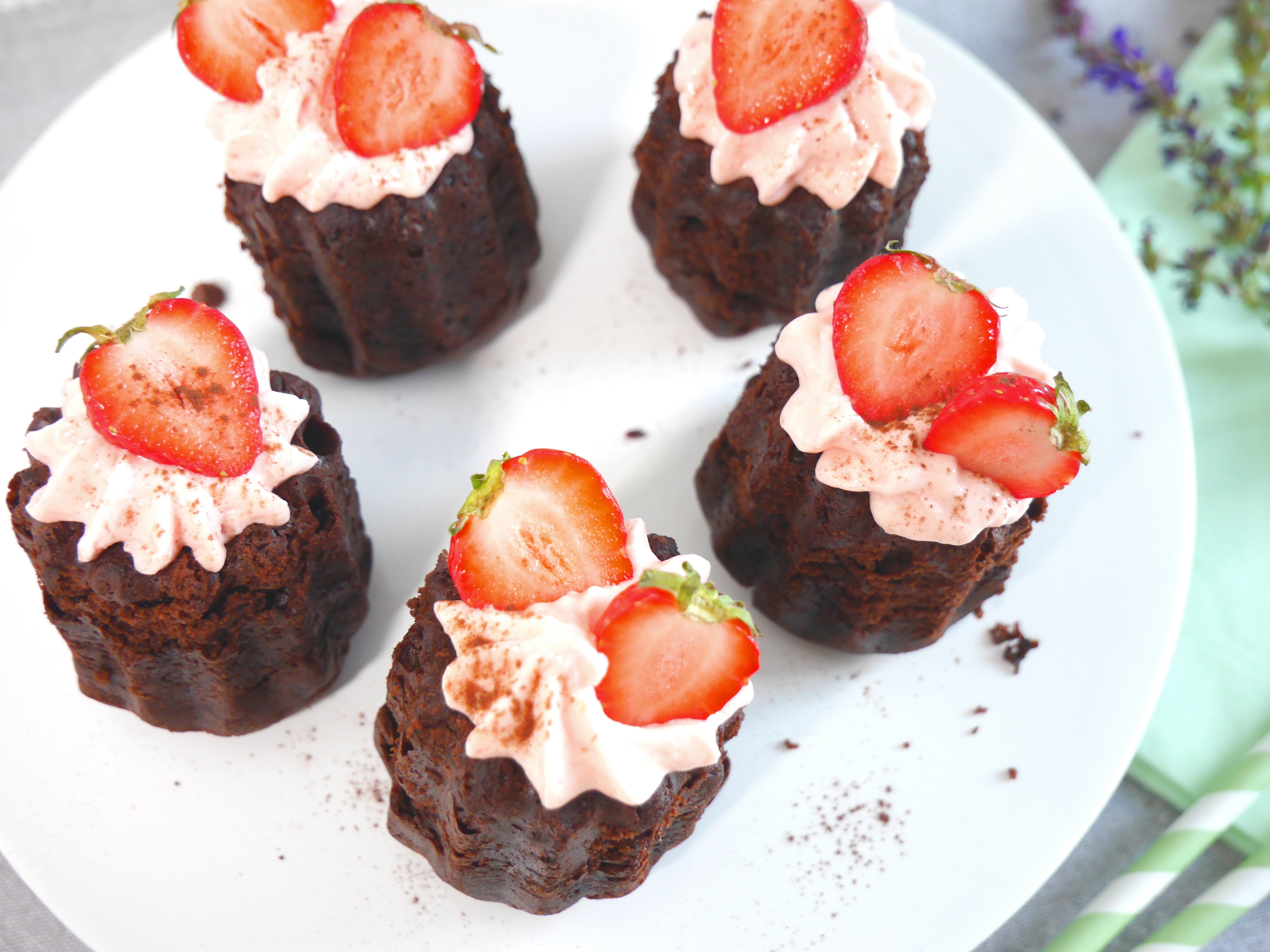3. Für die Deko die Erdbeeren mit Strunk halbieren, jeweils auf die Törtchen dekorieren und mit etwas Kakaopulver verzieren.