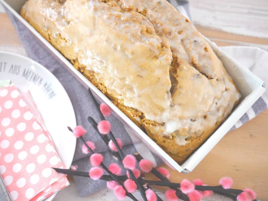 Die Eier mit dem Öl, dem Zucker, dem Vanillepulver und dem Salz schaumig schlagen. Die übrigen Zutaten mischen und zügig unter den Eischaum rühren. Zum Schluss die Zucchiniraspel dazugeben, mischen und den fertigen Teig in eine große gefettete (am besten auch mit etwas Mehl ausgestäubte) Kastenform füllen.