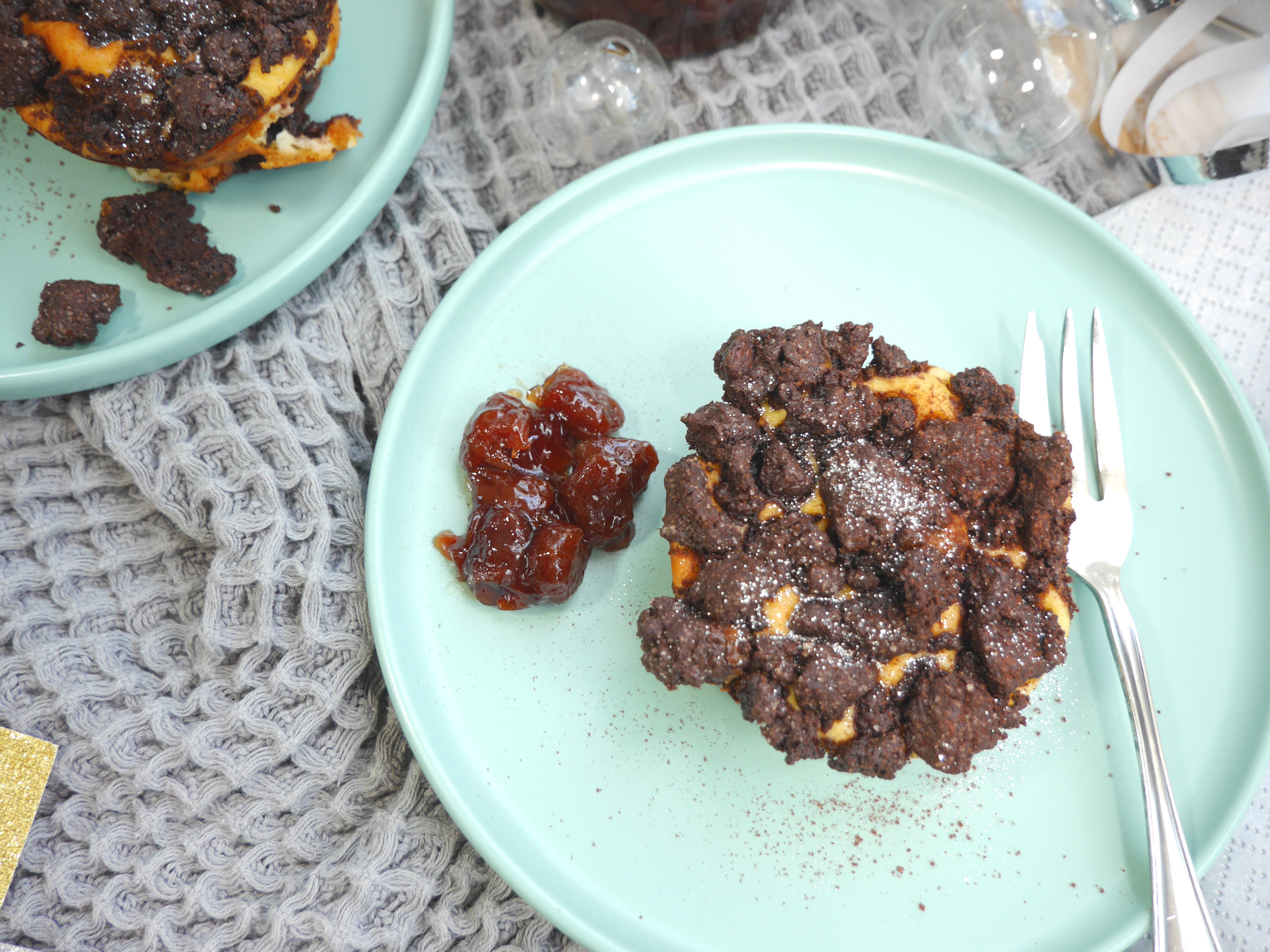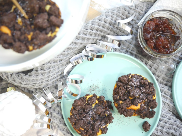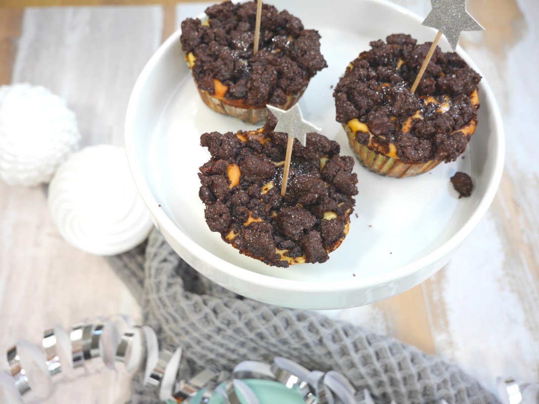 1. Für den Schoko-Teig alle Zutaten mit 2 EL Wasser mit den Händen zu Streuseln verkneten. Für ca. 30 Minuten in den Kühlschrank stellen.