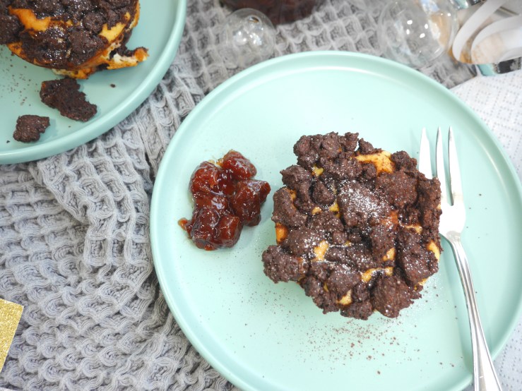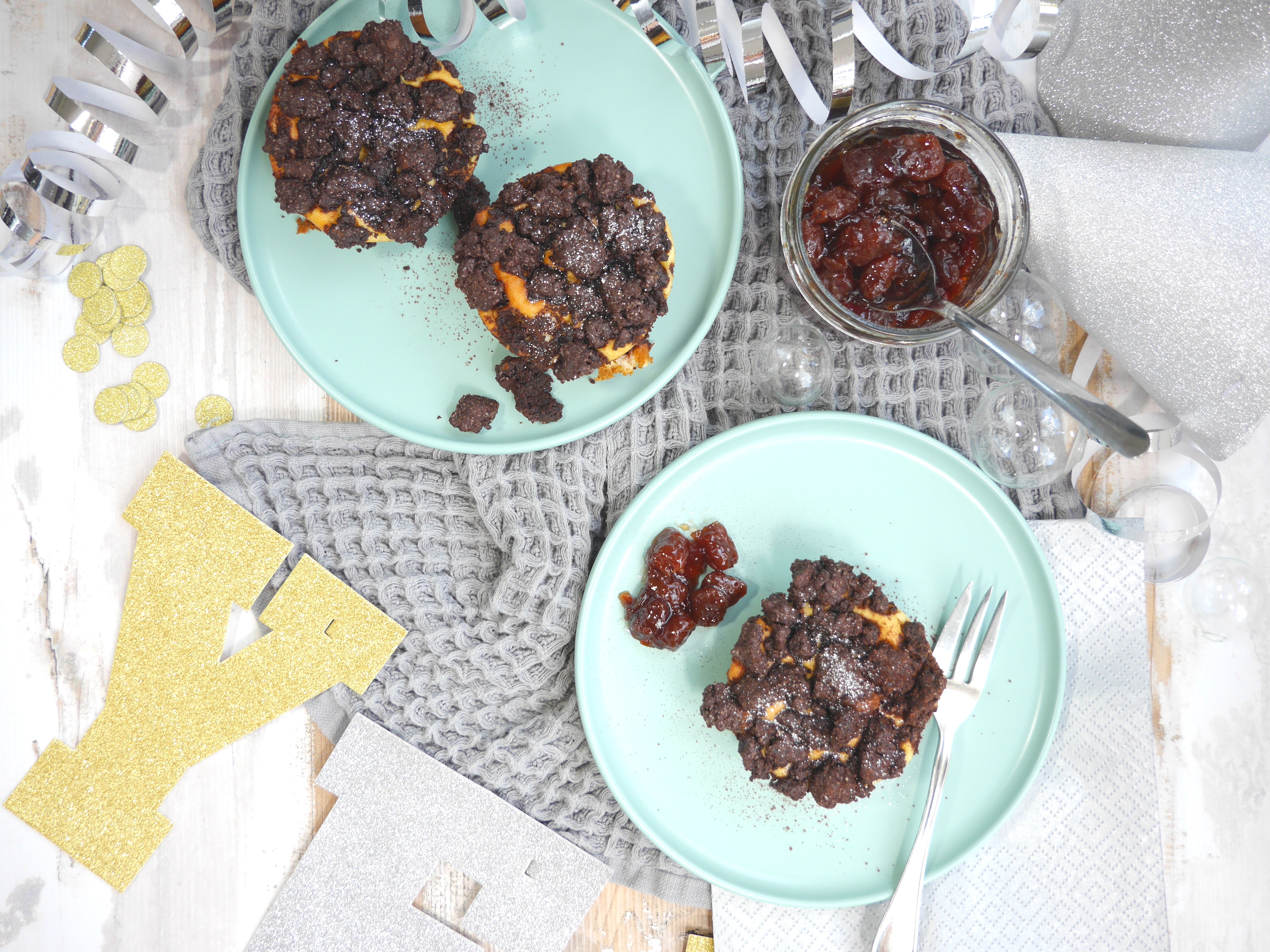 Die Hälfte des Schoko-Teiges in die 12 Papierförmchen verteilen und leicht andrücken. Die die Kirschen darauflegen, jeweils in die Mitte zwei Amarena-Kirschen oder etwas Kirschmarmelade geben und mit der Quark-Füllung bedecken. Zum Schluss den restlichen Teig darüber streuen.