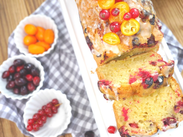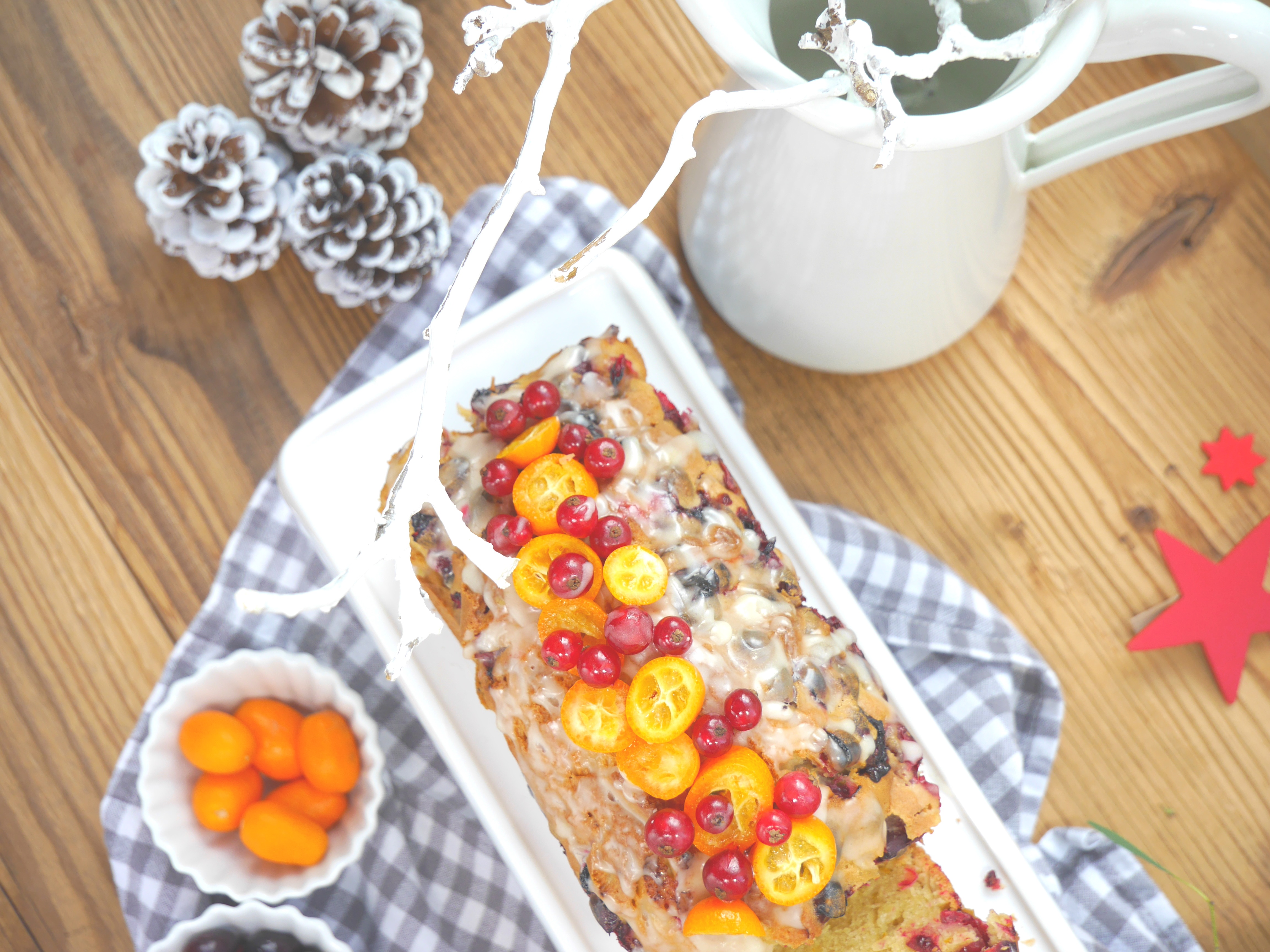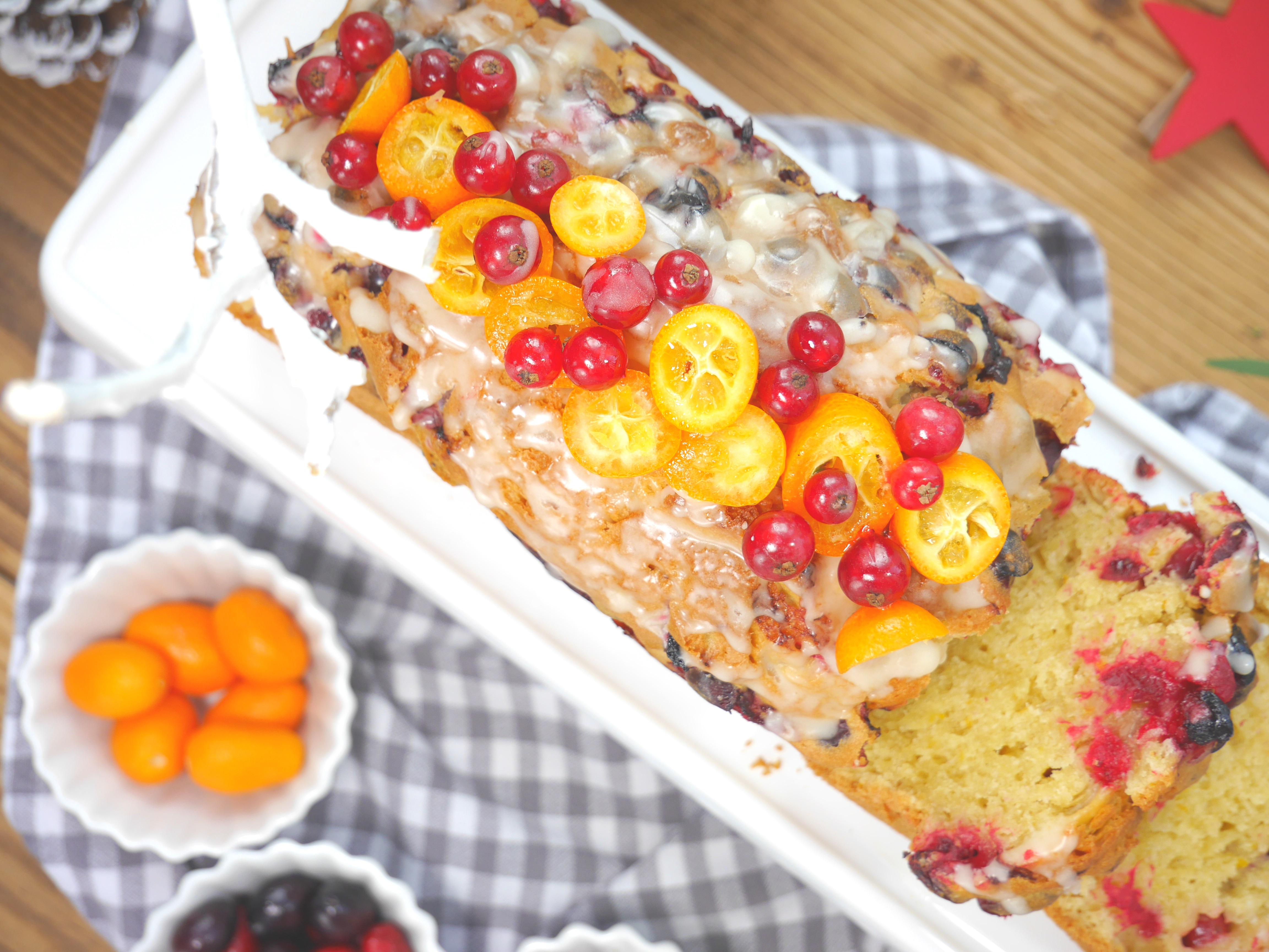 3. Für die Deko die Früchte waschen und trocken tupfen. Die Kumquats in Scheiben schneiden und den Kuchen damit verzieren.