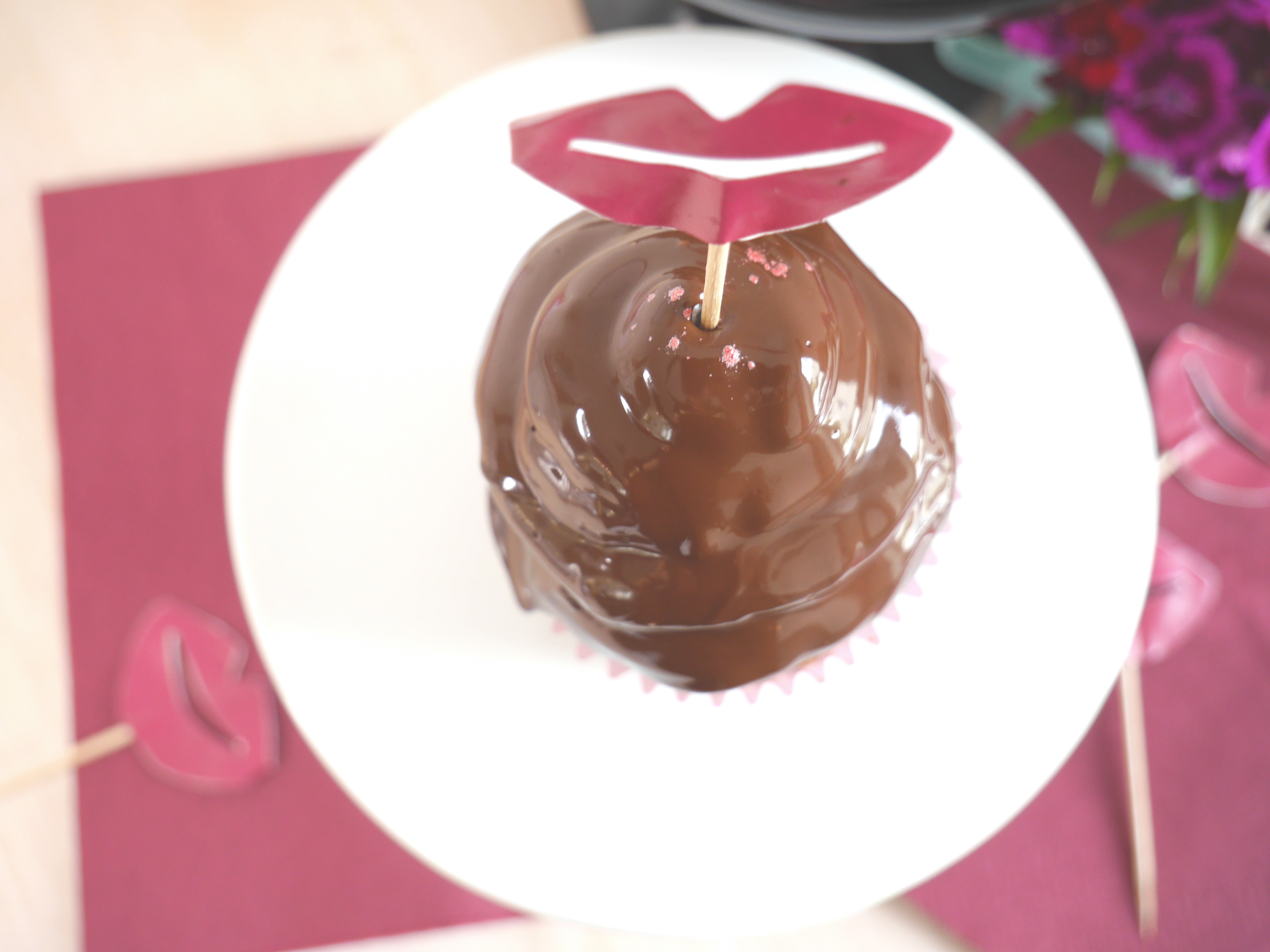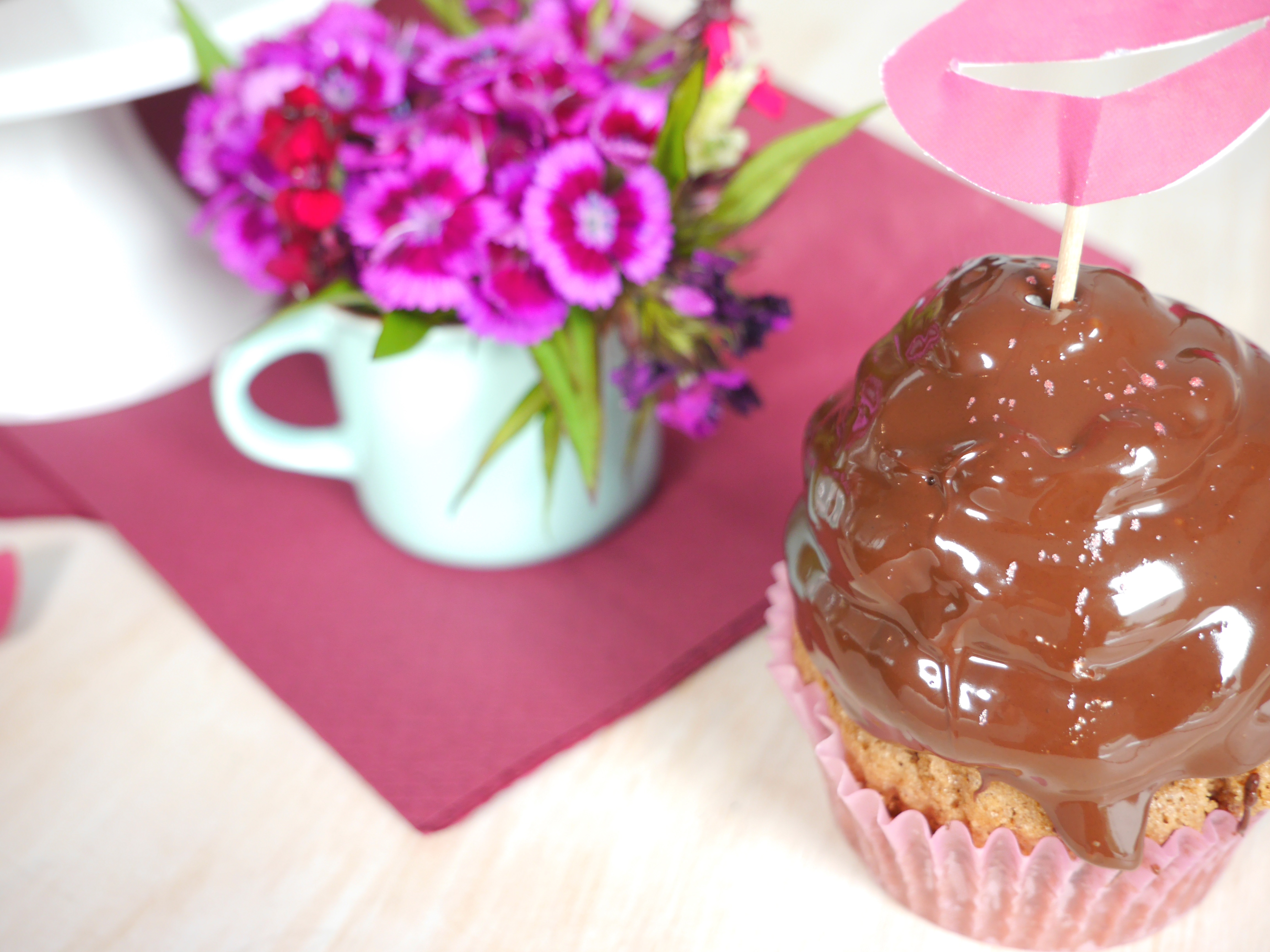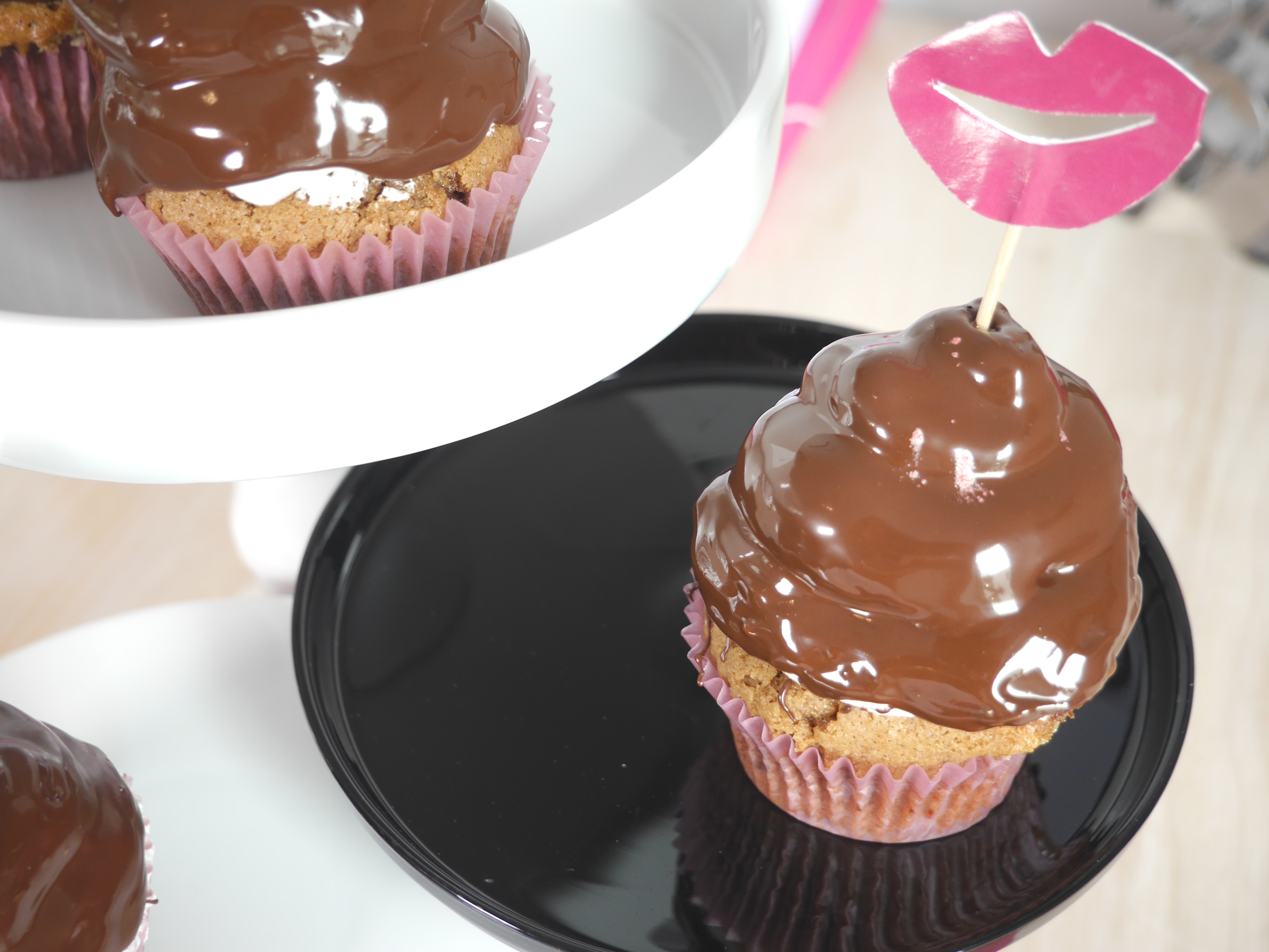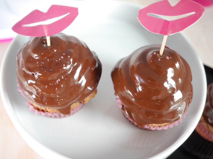 3. Für die Deko die Kuvertüre hacken und zusammen mit dem Palmin in einem Topf langsam schmelzen. Die Schokoladenmischung etwas abkühlen lassen, sodass sie sich lauwarm anfühlt und jeden Cupcake damit vorsichtig bedecken.