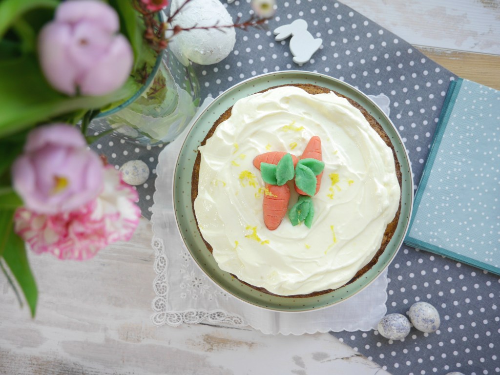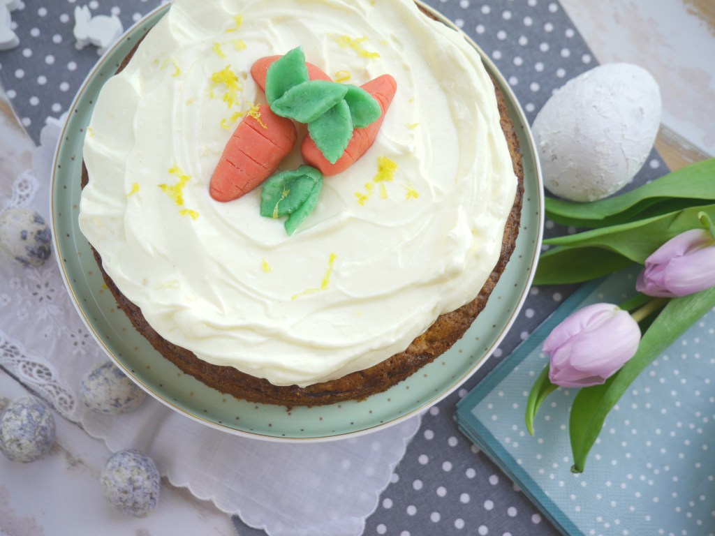 3. Für die Deko den Kuchen mit den Marzipankarotten und dem Zitronenabrieb verzieren.