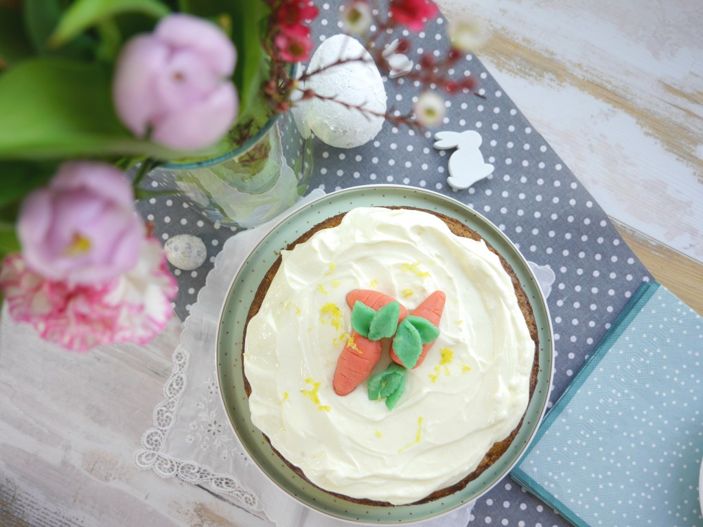 1. Für den Teig den Zucker, mit dem Öl, den Eiern, dem Vanillepulver, Zimt, Salz und Joghurt mischen. Mehl und Backpulver dazu sieben. Die geriebenen Karotten zusammen mit den Walnüssen zum Teig geben und mischen. Den fertigen Teig in eine mit Backpapier ausgelegte und gefettete Springform (26 cm Durchmesser) füllen und im vorgeheizten Backofen ca. 40-45 Minuten bei 180 Grad Umluft backen. Vollständig abkühlen lassen