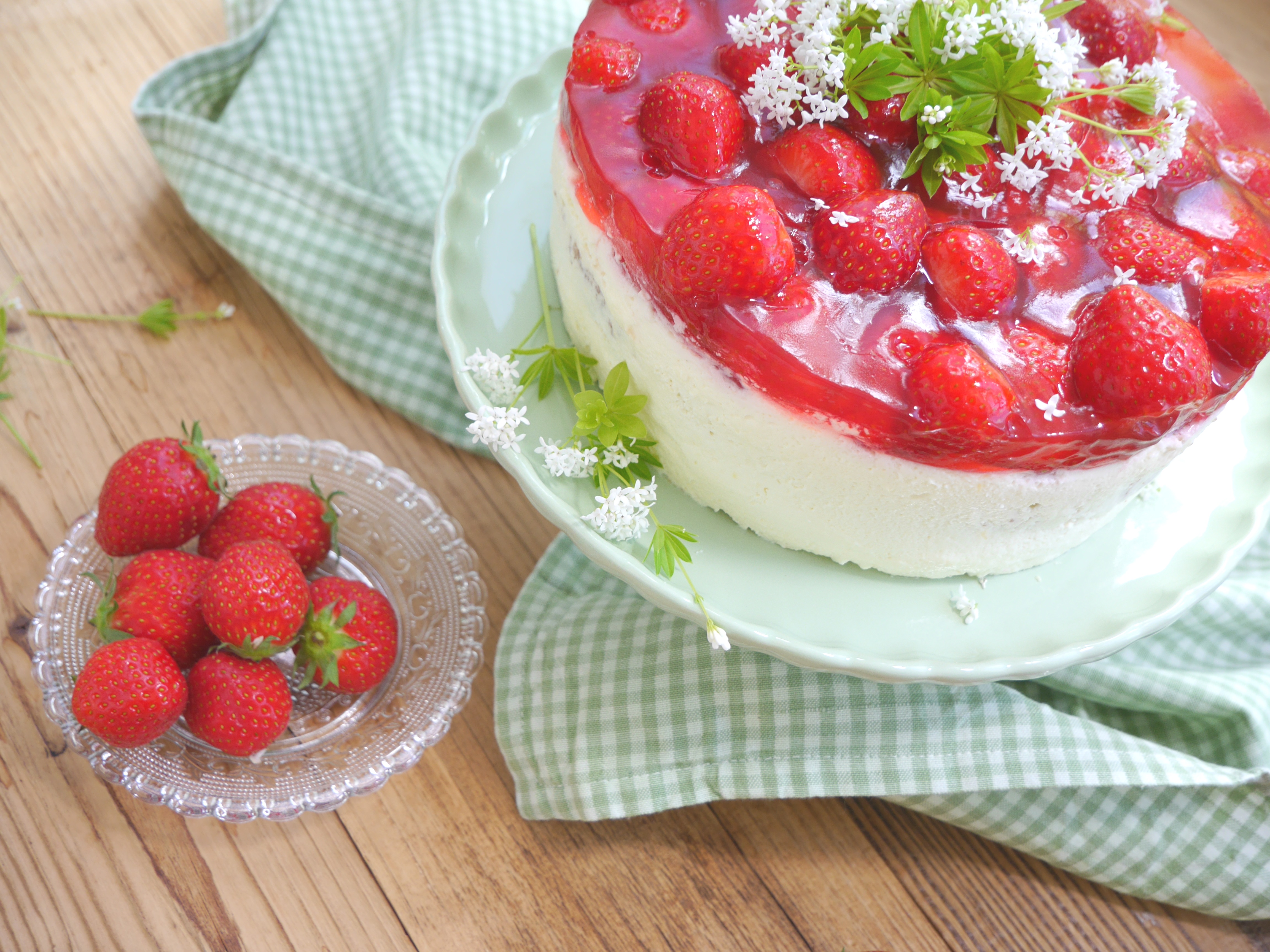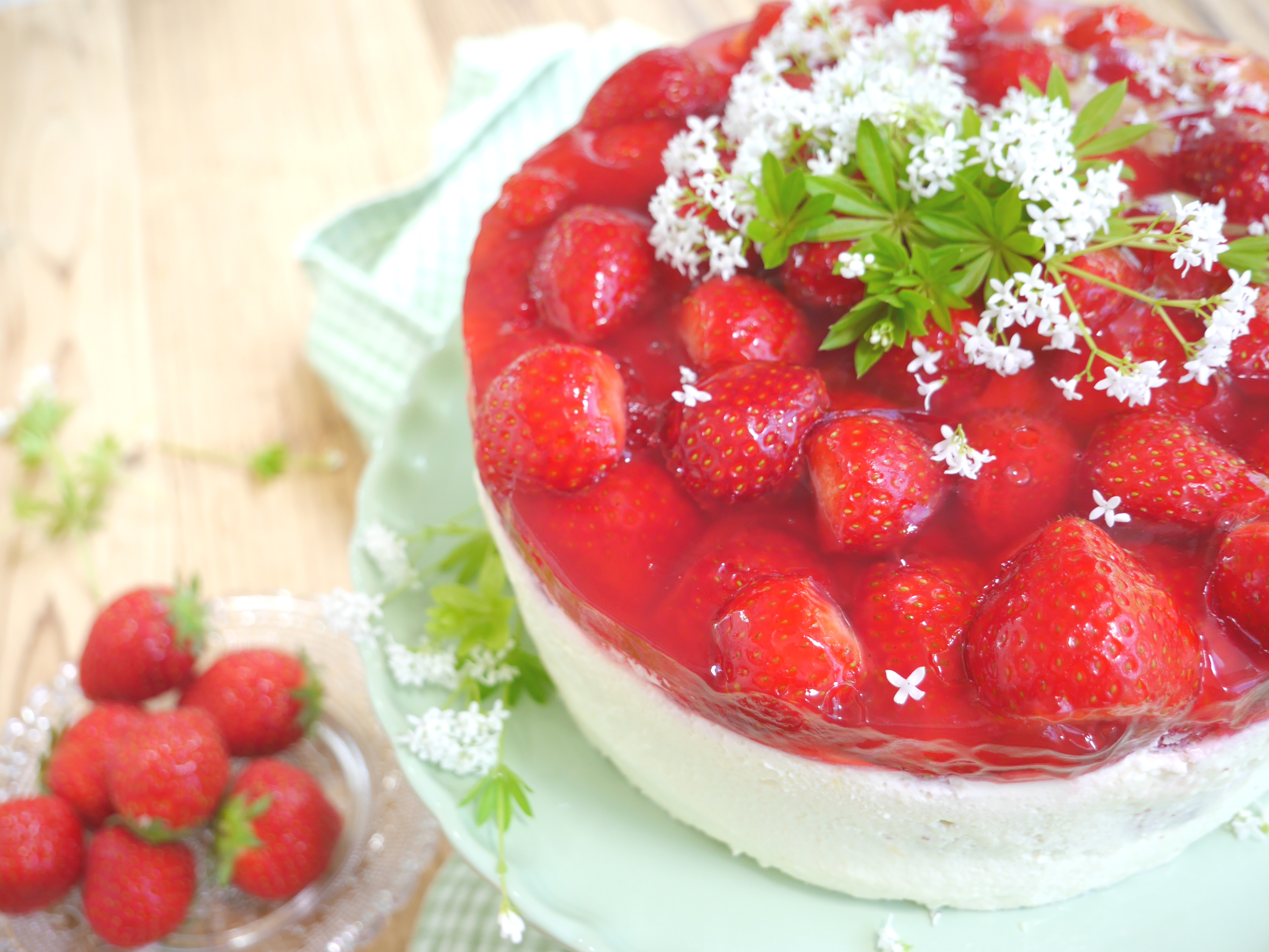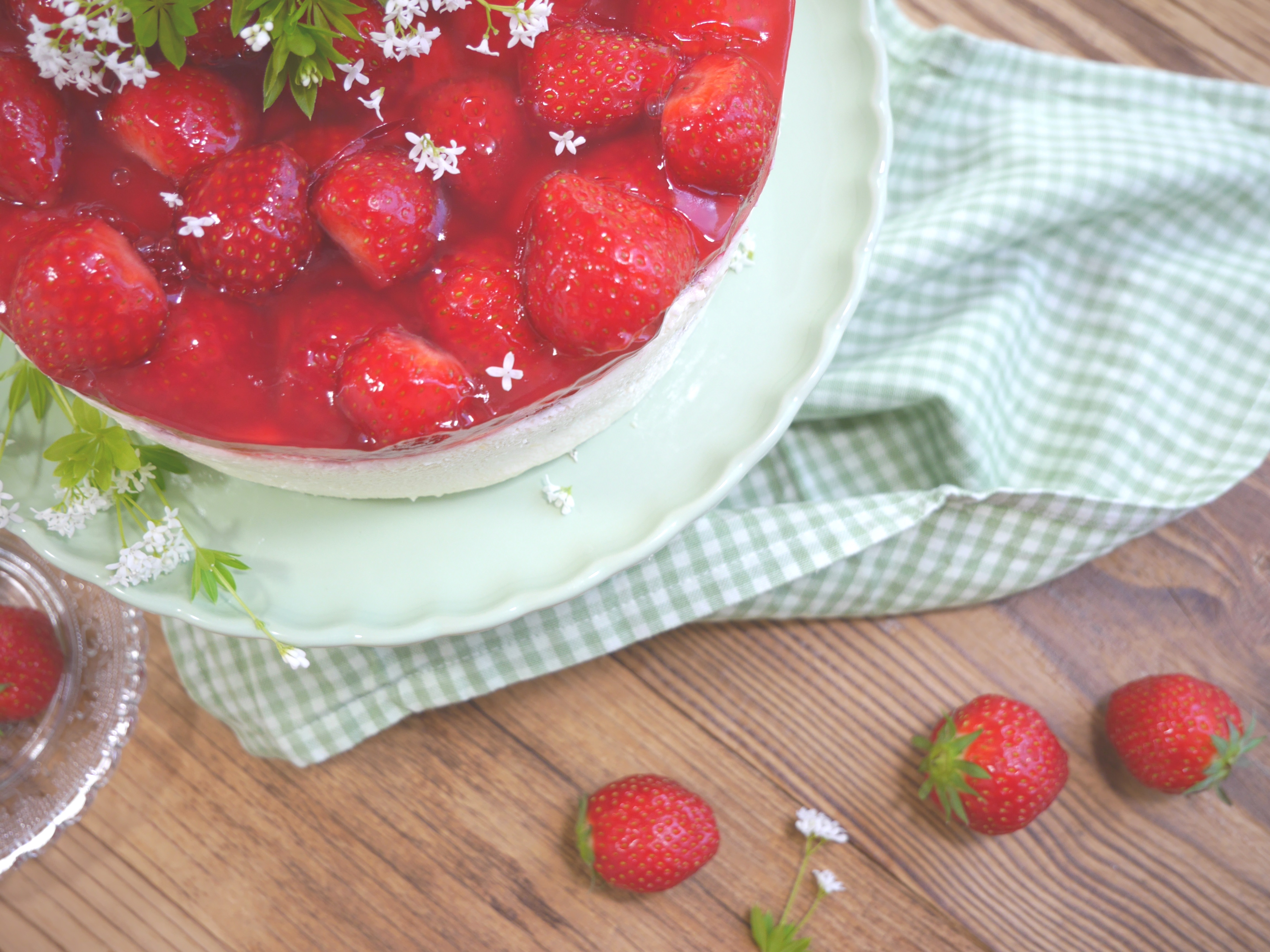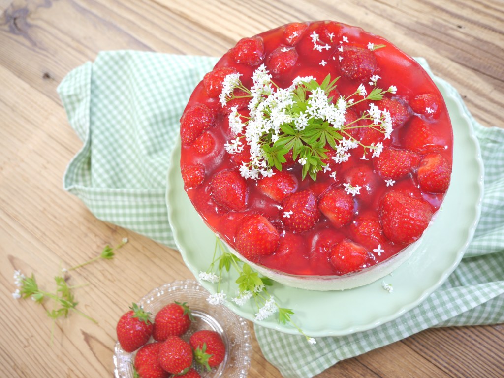 4. Für die Deko die frischen Waldmeisterzweige waschen, trocken tupfen und die Torte damit verzieren.