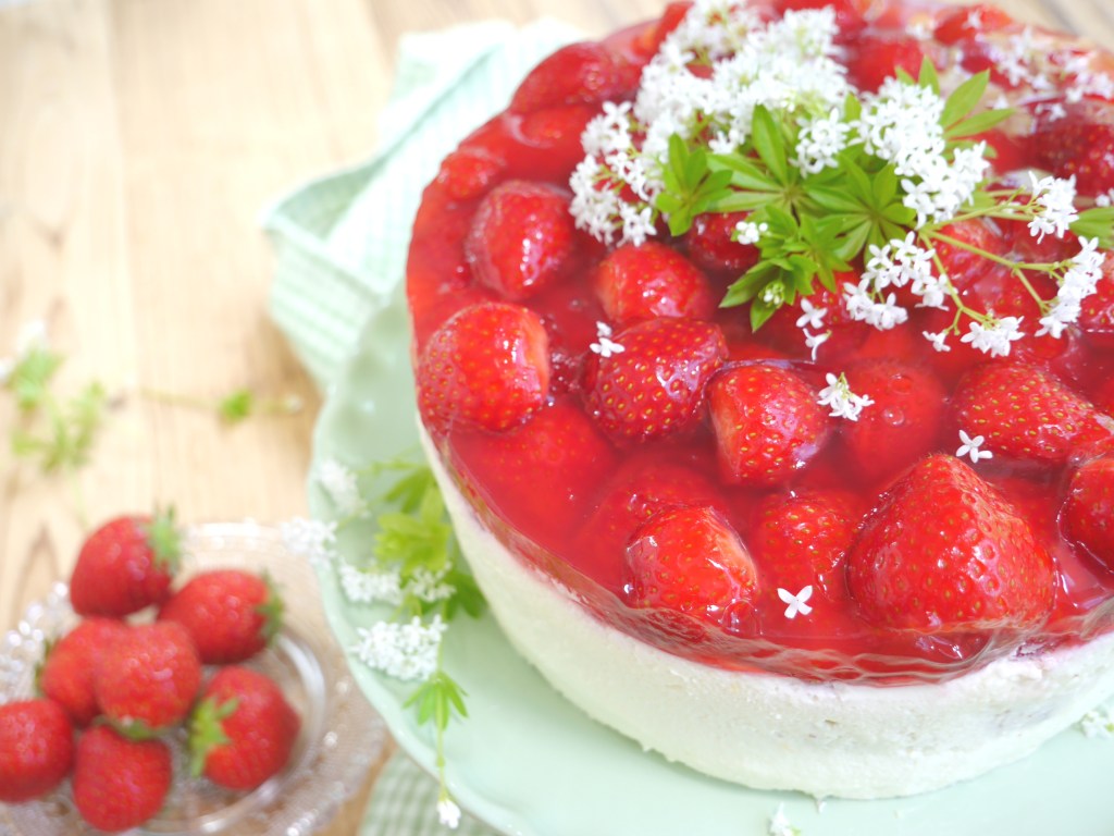 3. Für die Erdbeerschicht die Erdbeeren waschen, putzen und halbieren. Die Erdbeerhälften auf der Torte verteilen. Den Tortenguss nach Packungsanleitung zubereiten und auf den Erdbeeren verteilen. Die Torte sollte abschließend mindestens eine weitere Stunde kühlen.