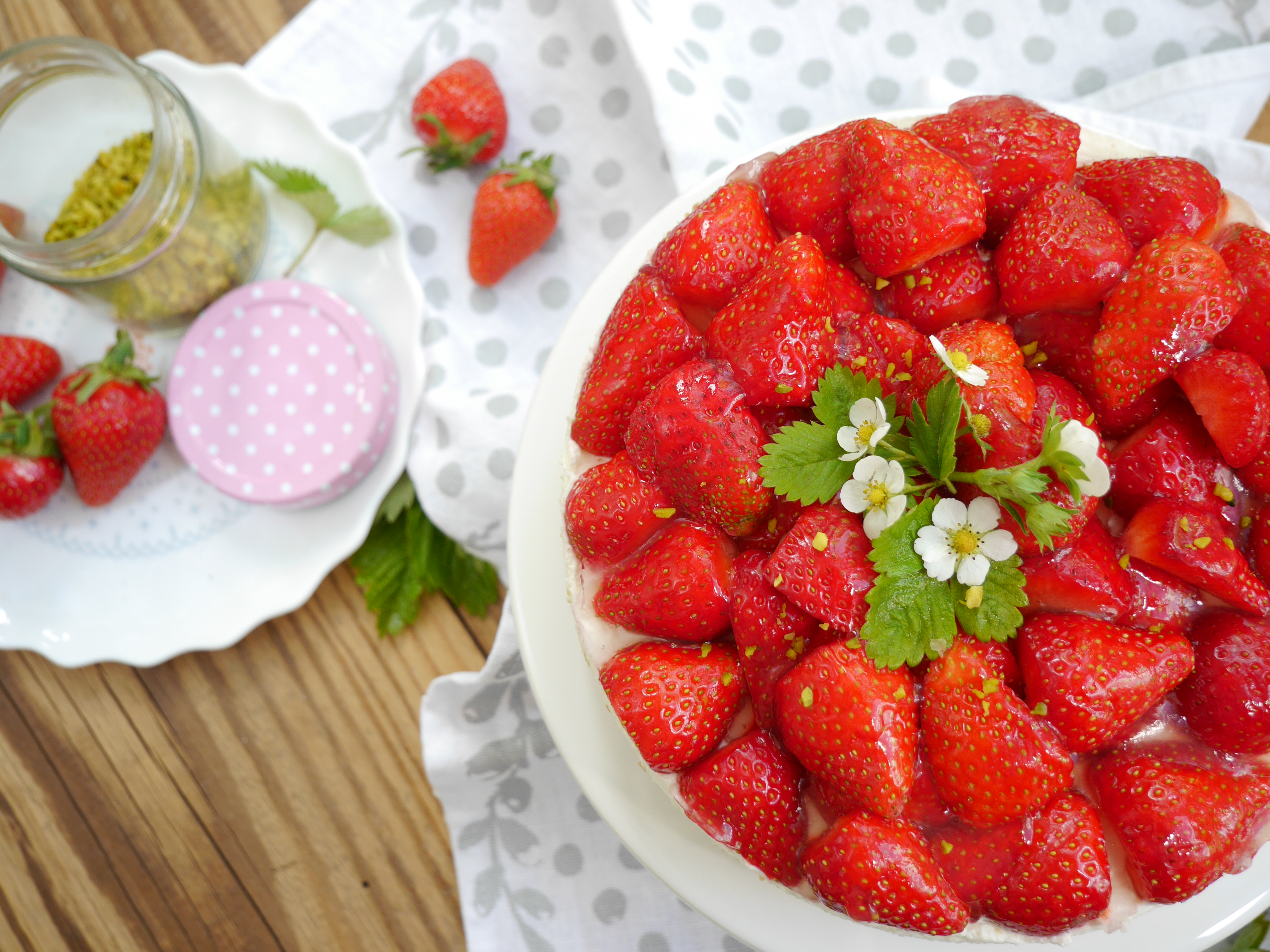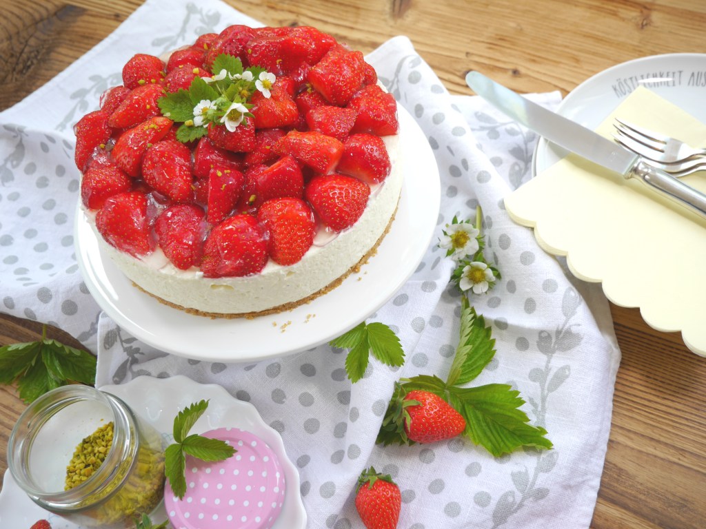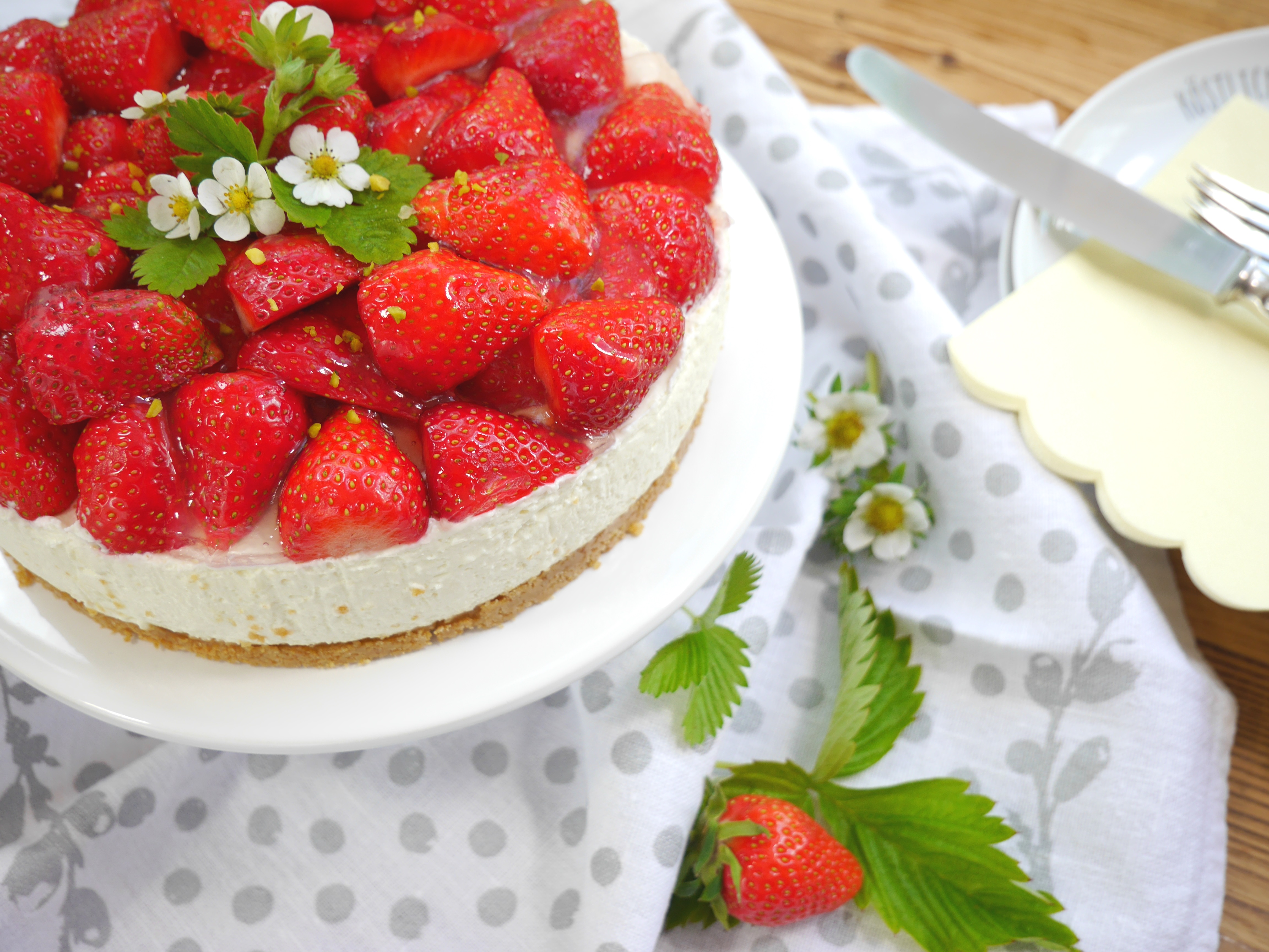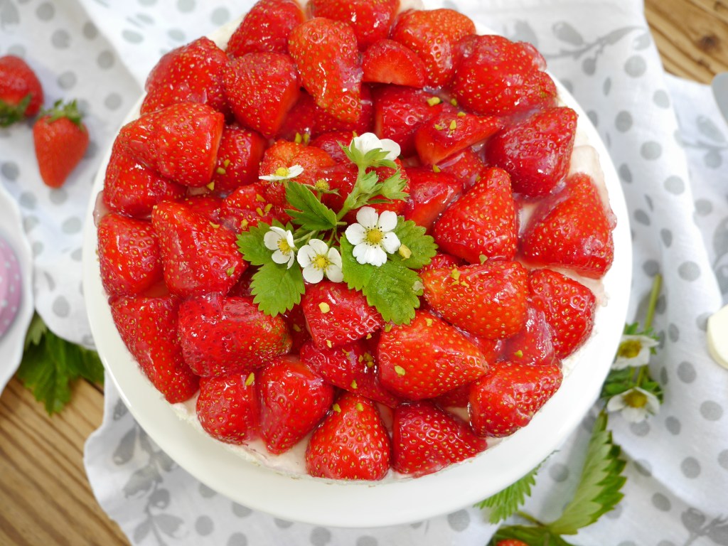 3. Für die Deko die Erdbeeren waschen, putzen und halbieren. Den Kuchen damit belegen.