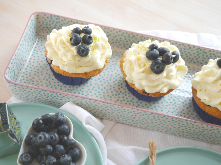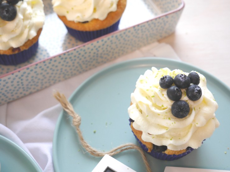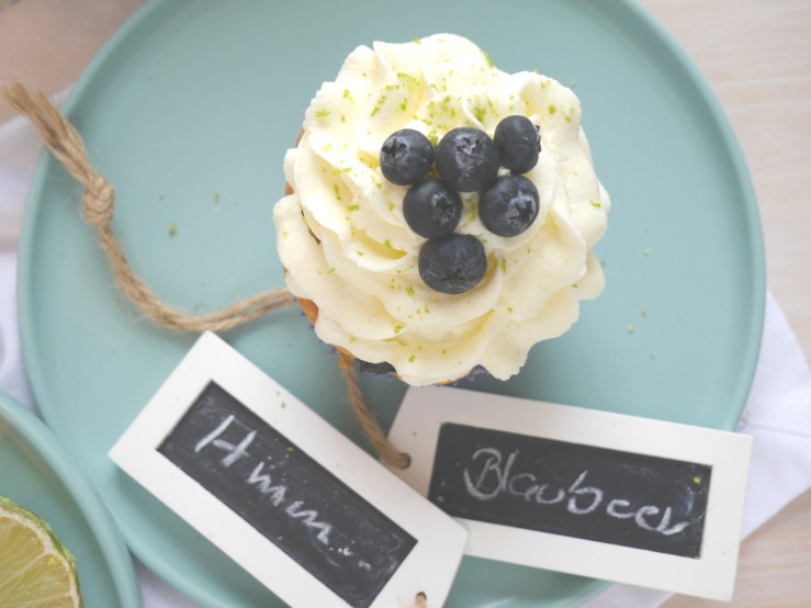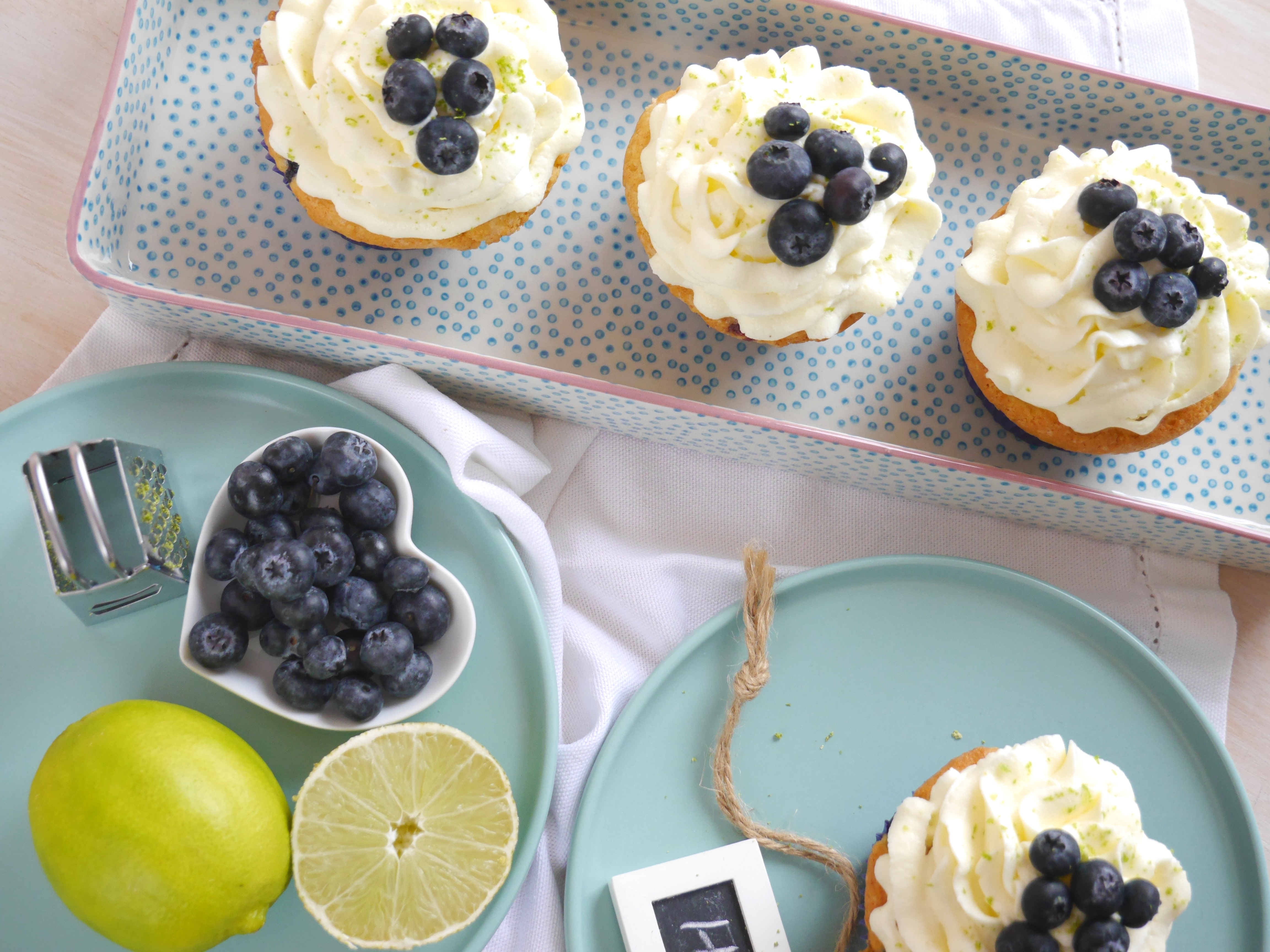 3. Für die Deko den Cupcakes mit der Creme, den Blaubeeren und dem Limettenabrieb dekorieren.