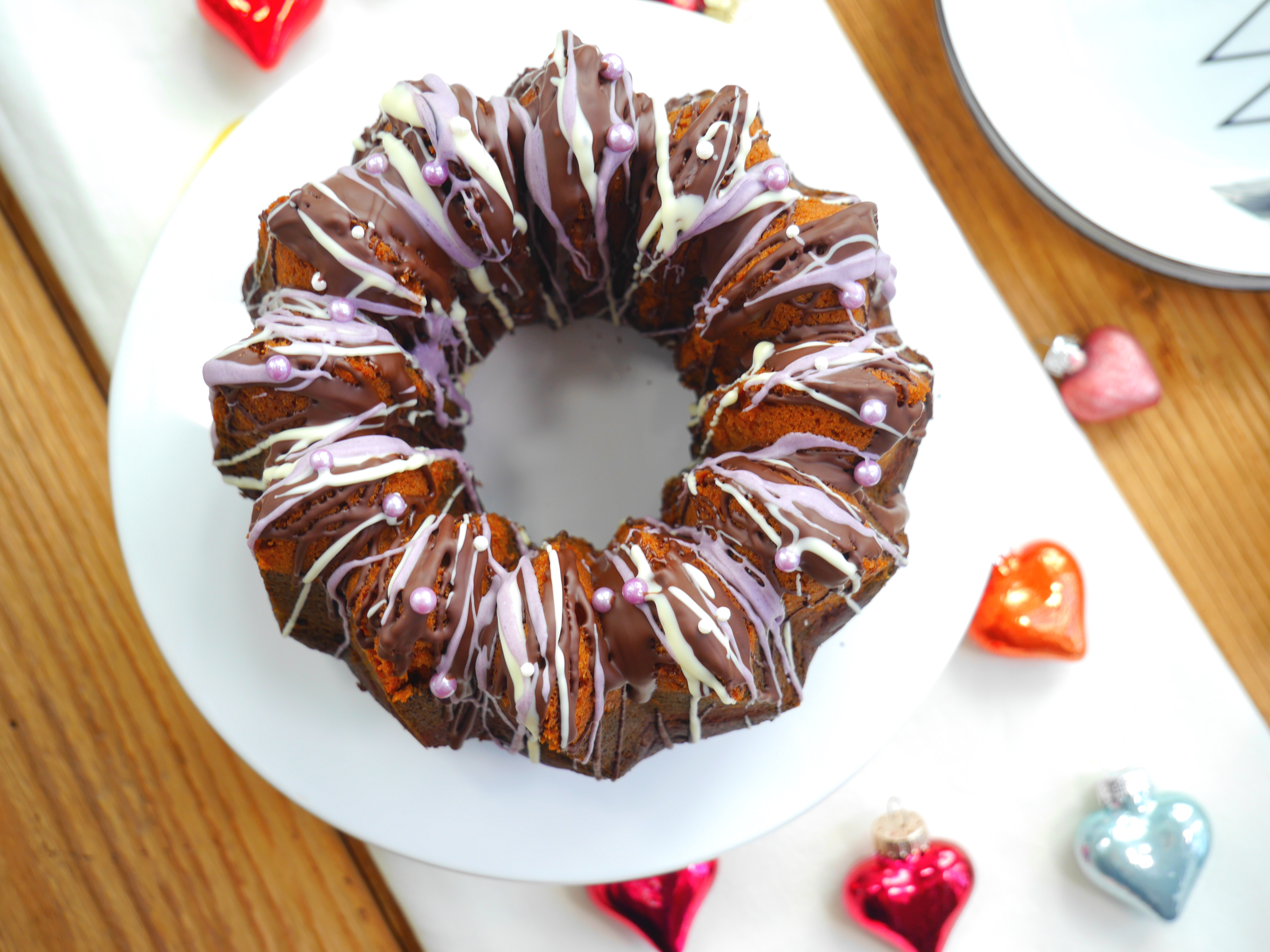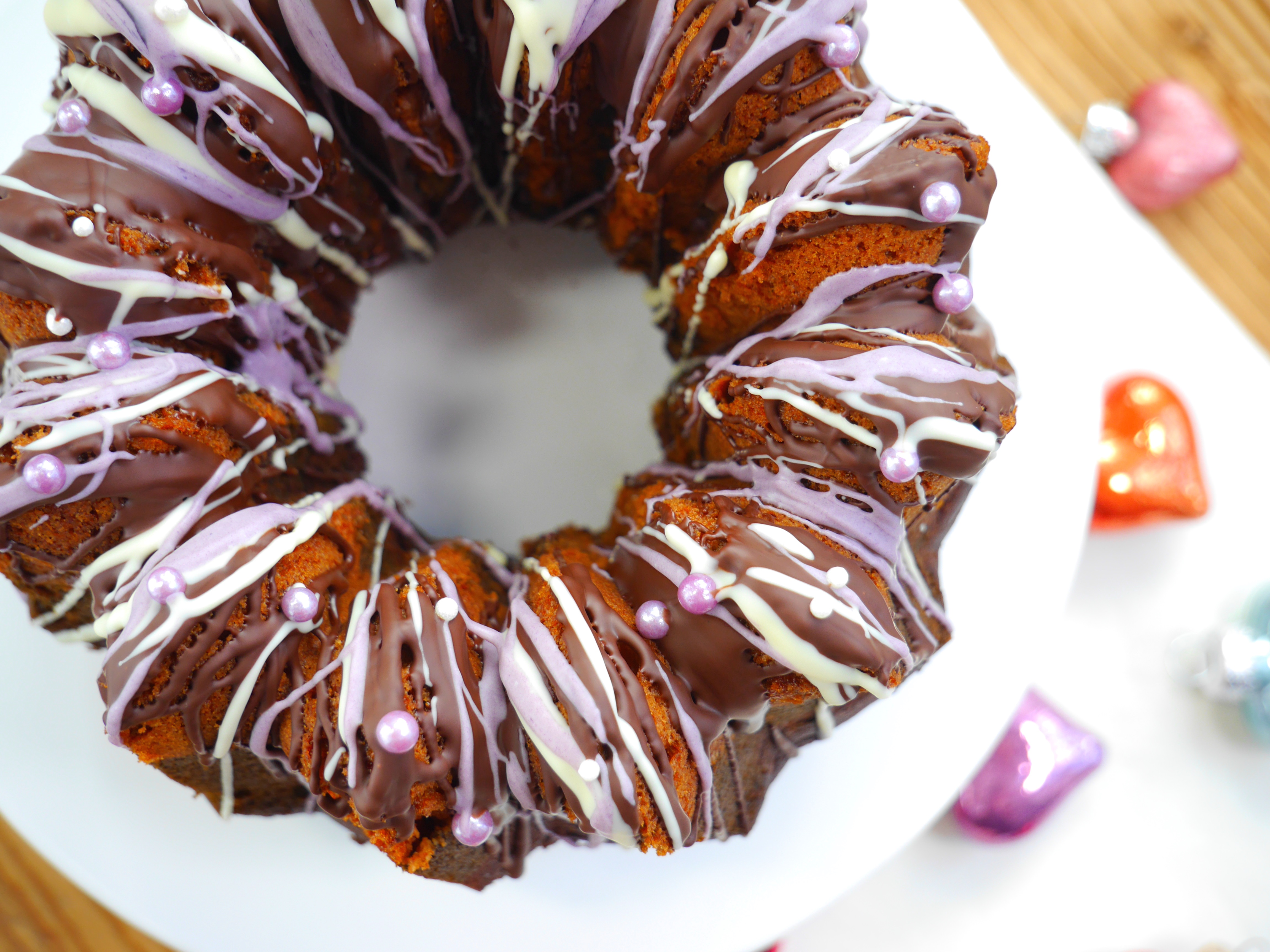 2. Für die Deko die Kuvertüre schmelzen und den Kuchen damit überziehen. Die Kuchenglasur nach Packungsangabe erhitzen nach Belieben mit der gewünschten Lebensmittelfarbe einfärben. Den Kuchen damit dekorieren und ggf. Zuckerperlen darüber streuen.