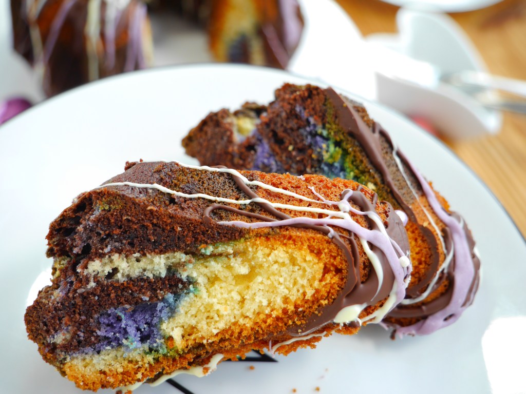In eine gefettete Marmorkuchen-Form (Durchmesser 20 cm) erst den hellen Teig (2/4) einfüllen, dann den bunten Teig darauf verteilen und abschließend den dunklen Teig in die Form füllen. Mit einer Gabel ein schönes Marmor-Muster erzeugen.