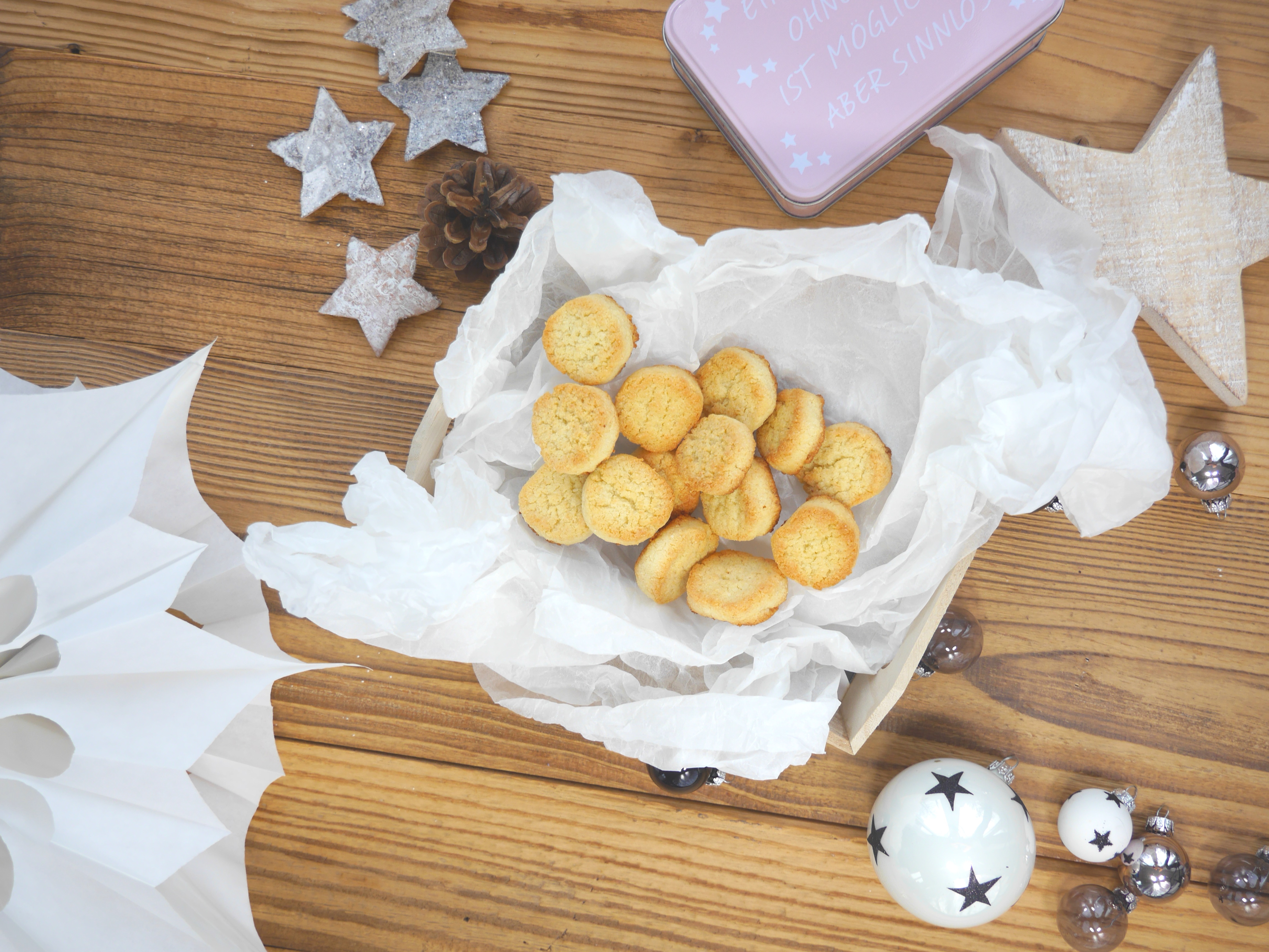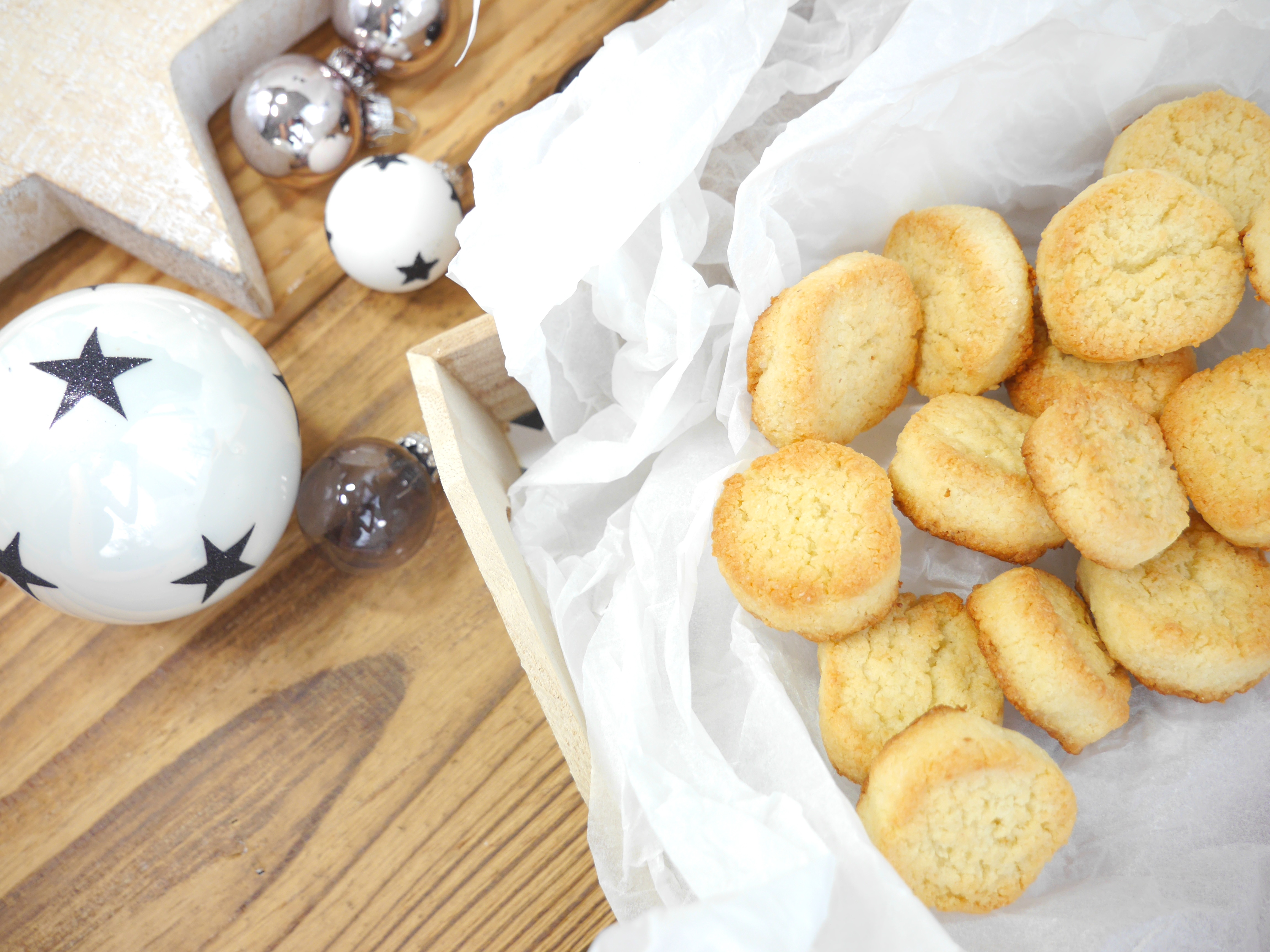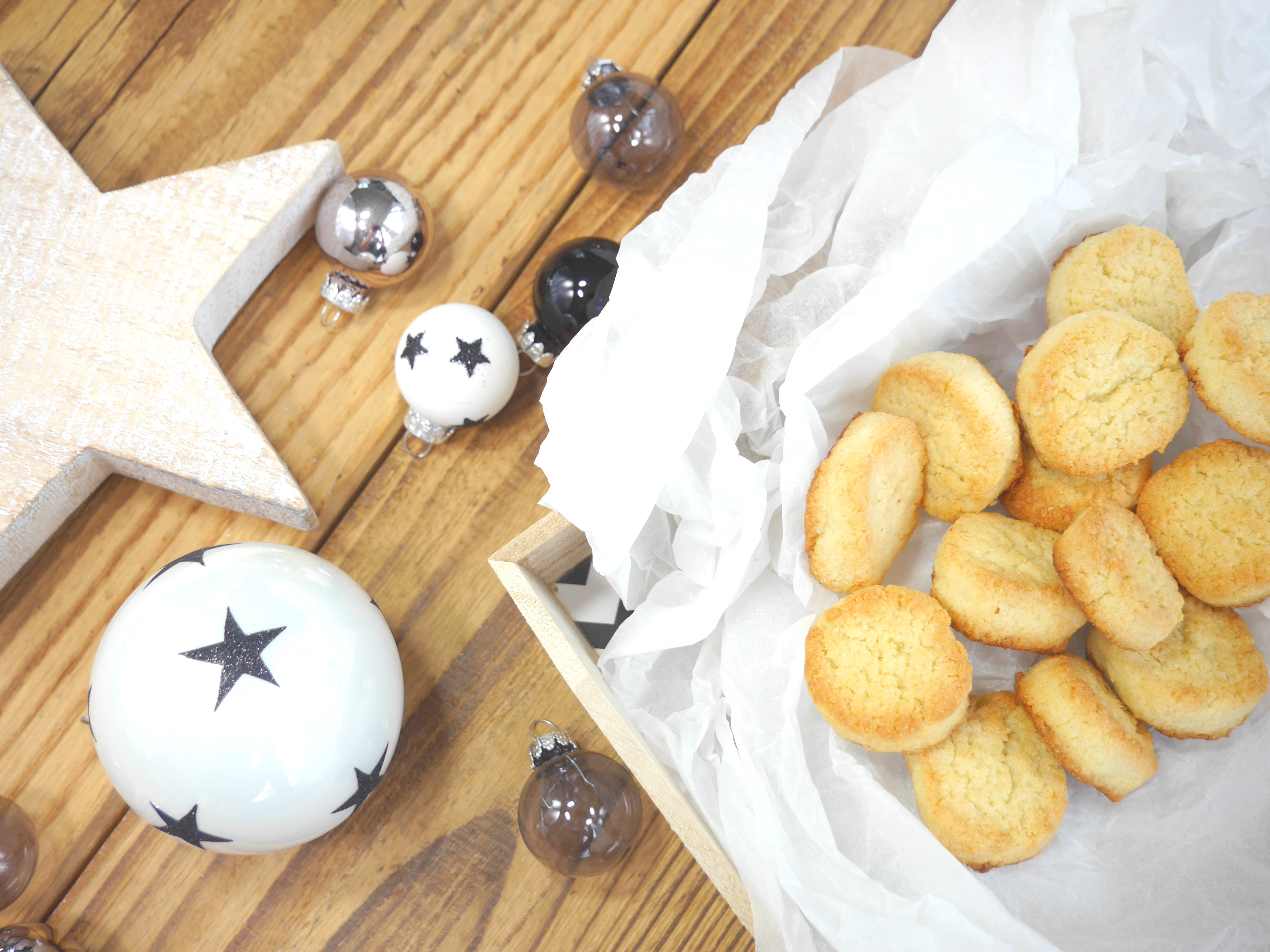 Den Teig auf einer bemehlten Arbeitsfläche zu 8 Rollen mit einem Durchmesser von ca. 4 cm rollen und mit einem Messer in 1 cm dicken Scheiben schneiden. Die Scheiben bzw. Taler auf ein mit Backpapier belegtes Blech legen und im vorgeheizten Backofen bei 180 Grad Ober-/Unterhitze ca. 10 Minuten goldbraun backen. Vollständig abkühlen lassen.