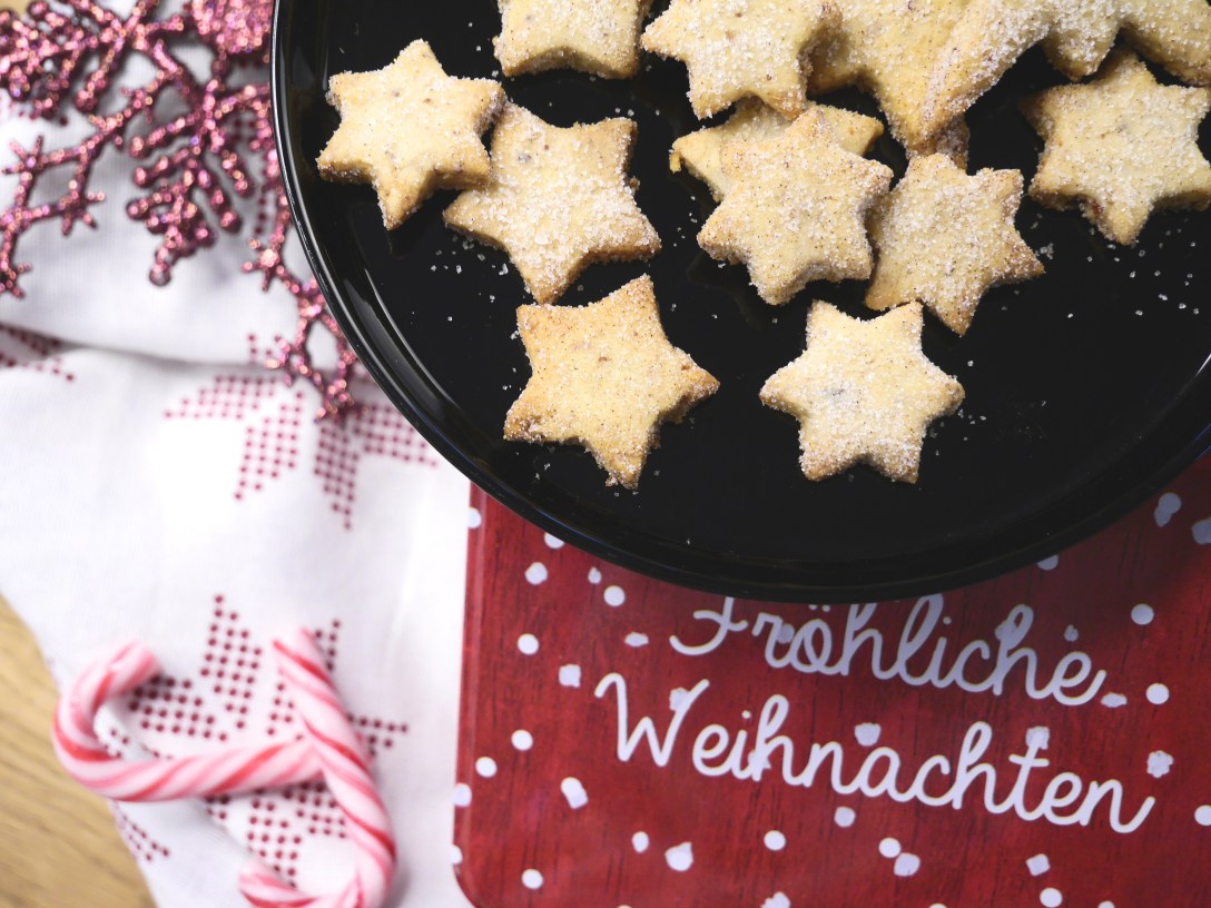 Den Teig auf einer bemehlten Arbeitsplatte ca. 6 mm dünn ausrollen und beliebig Sterne ausstechen. Die Sterne auf einem Backblech mit Backpapier bei 160 Grad Umluft ca. 8 Minuten goldgelb backen.