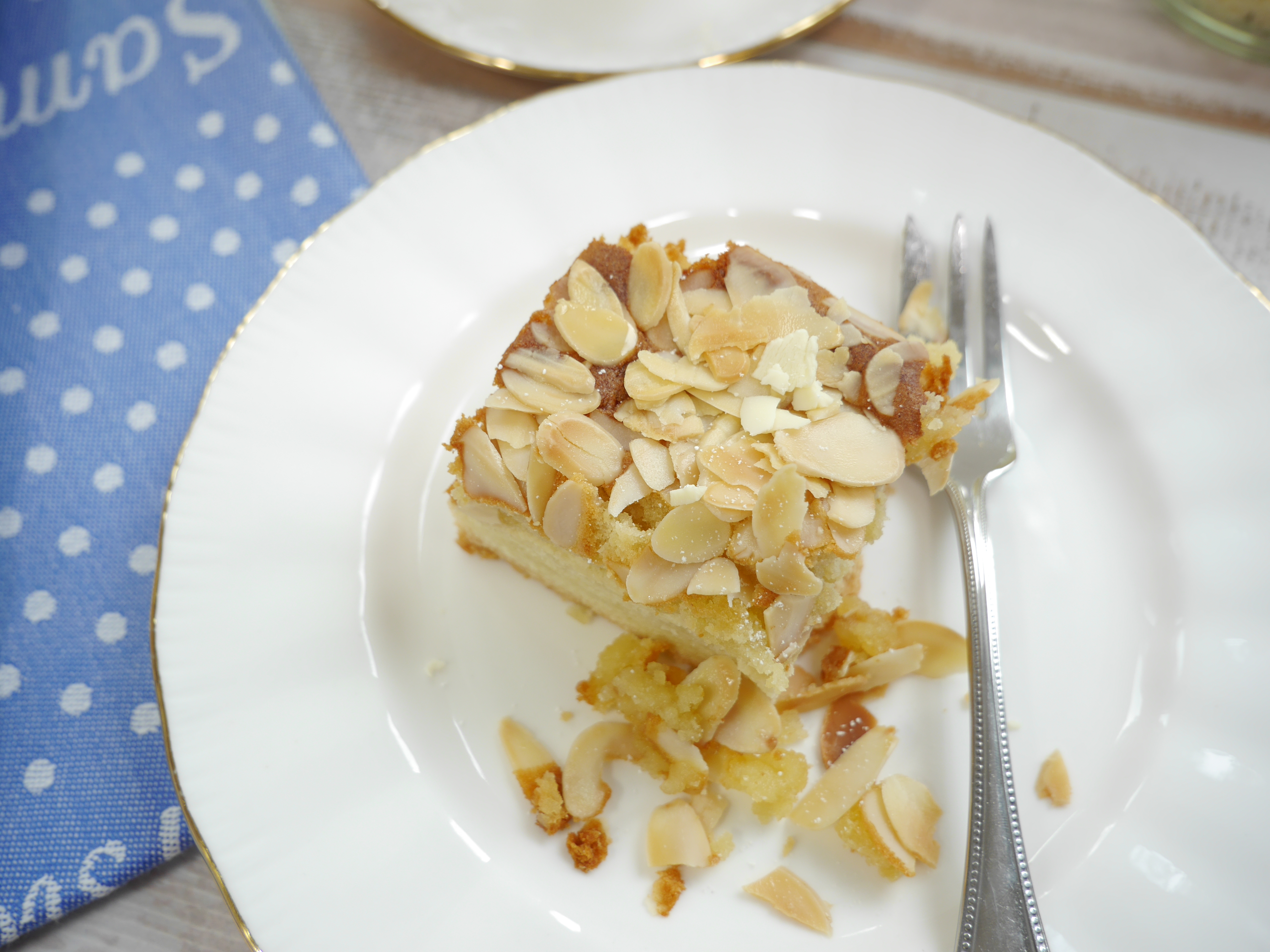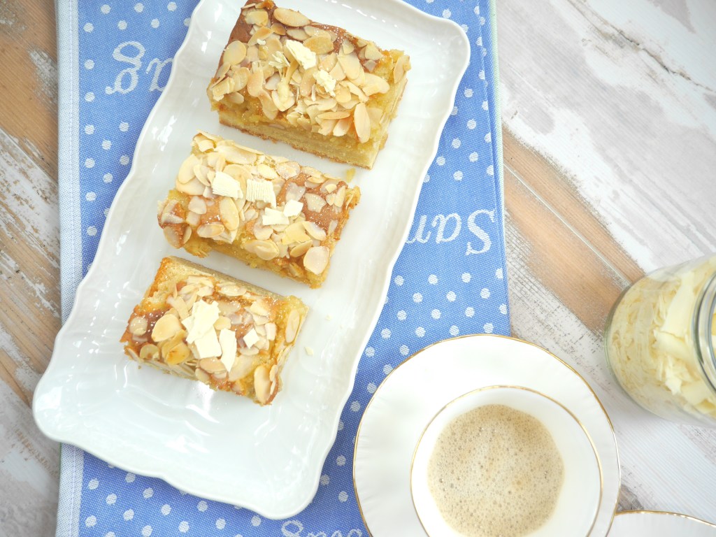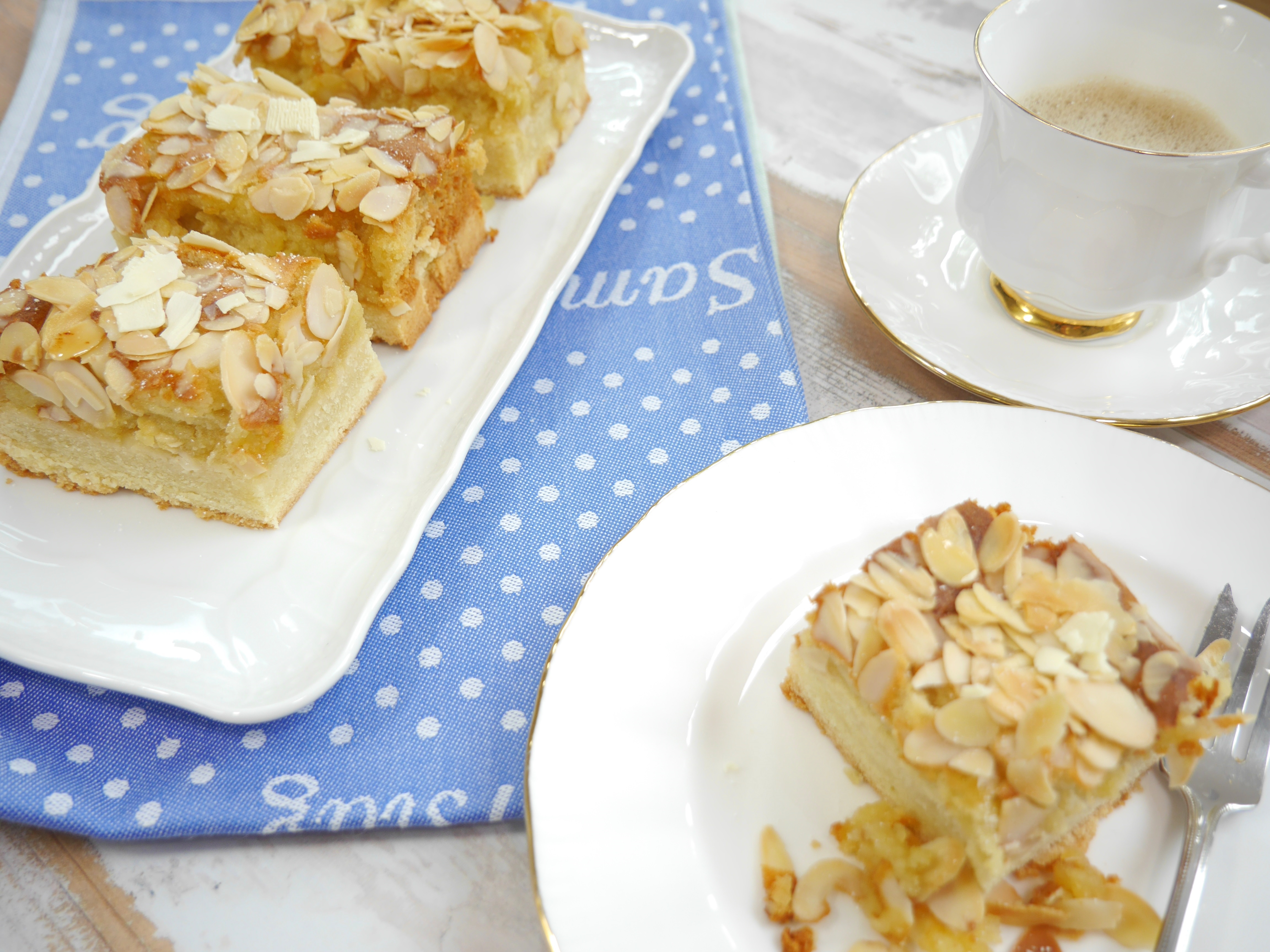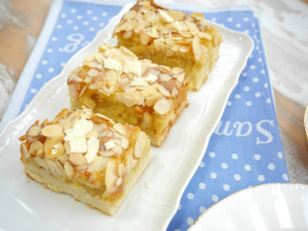 2. Für die Marzipanschicht in der Zwischenzeit das Marzipan, der Butter, dem Puderzucker und den Eiern cremig rühren. Die fertige Marzipanmasse auf den heißen Boden streichen und mit den Mandelblättchen bedecken. Den Kuchen erneut in den Ofen geben und bei gleicher Temperatur ca. 25 Minuten goldgelb backen.