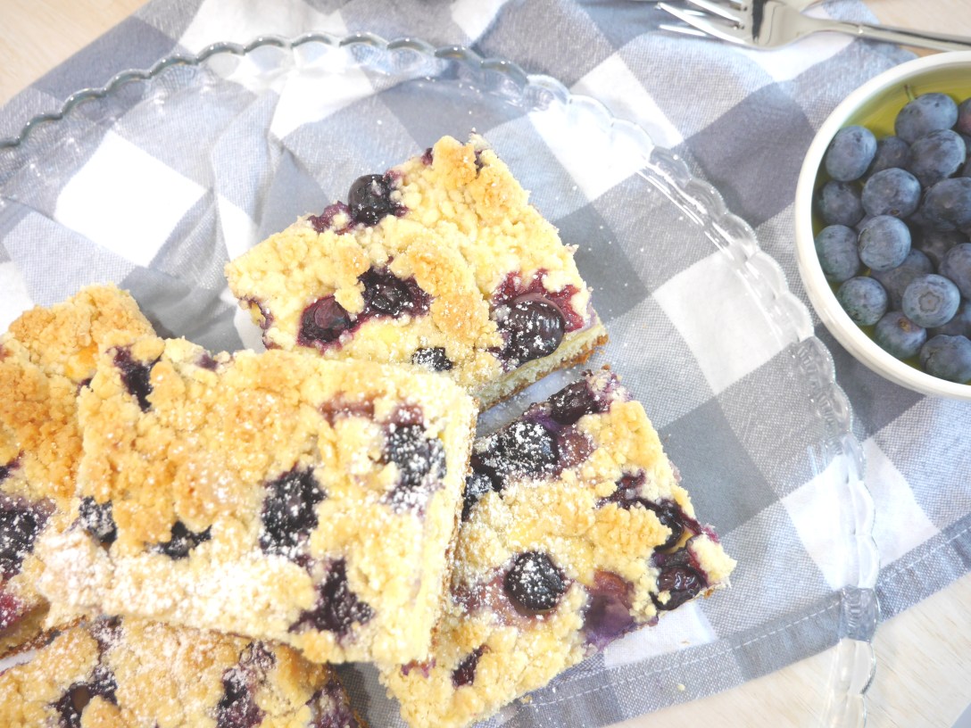 Den Teig mit der Quarkcreme bestreichen, die Beeren und die Streusel darauf verteilen. Den Kuchen bei 180 Grad Umluft auf mittlerer Schiene 45-50 Minuten backen.