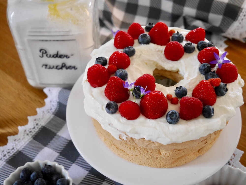 1. Für den Teig die Eiweiße vorsichtig von den Eigelben trennen. Es darf dabei kein bisschen Eigelb in das Eiweiß gelangen.Die Stärke, das Mehl und 60 g des Puderzuckers mischen und 3-mal fein sieben. Die Eiweiße in einer großen Schüssel leicht steif schlagen. Den restlichen Puderzucker (215 g) langsam einrieseln lassen und den Eischnee weiter schlagen, bis er steif ist und glänzt.Ein Drittel der Mehlmischung über den Eischnee sieben und mit einem Gummischaber vorsichtig unterheben. Erst dann die übrige Mehlmischung dazu sieben und unterheben. Den fertigen Teig nun in eine ungefettete (!) Silikonform in Kranzform füllen. Wenn keine passende Silikonform zur Hand, geht auch eine Springform (Durchmesser 24 cm), in deren Mitte man einen Servierring stellt.Die gefüllte Form vorsichtig zweimal auf die Küchenarbeitsplatte schlagen damit alle ungewünschten Luftlöcher verschwinden. Den Kuchen bei 190 Grad Ober- /Unterhitze im vorgeheizten Backofen auf mittlerer Schiene 25-30 Minuten backen.Den fertigen Kuchen auf ein Kuchengitter stürzen (dabei die Form nicht lösen) und mindestens 3 Stunden abkühlen lassen. Erst dann die Form vorsichtig lösen.