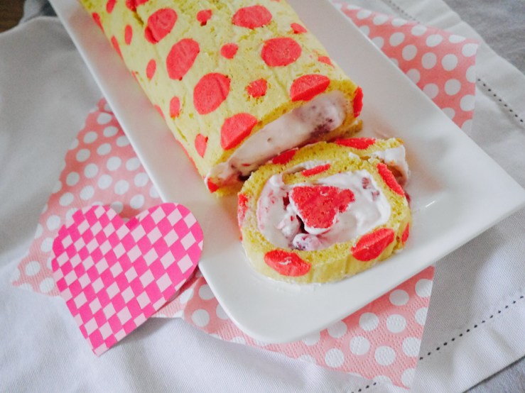 Tipp: Für die pinken Herzen in der Mitte (siehe Foto) 5 EL Biskuitteig wegnehmen, mit roter Lebensmittelfarbe mischen und neben dem Backrahmen auf einem Stück Backpapier dünn verstreichen. Nach dem Backen Herzen ausstechen und in die Rolle wickeln.