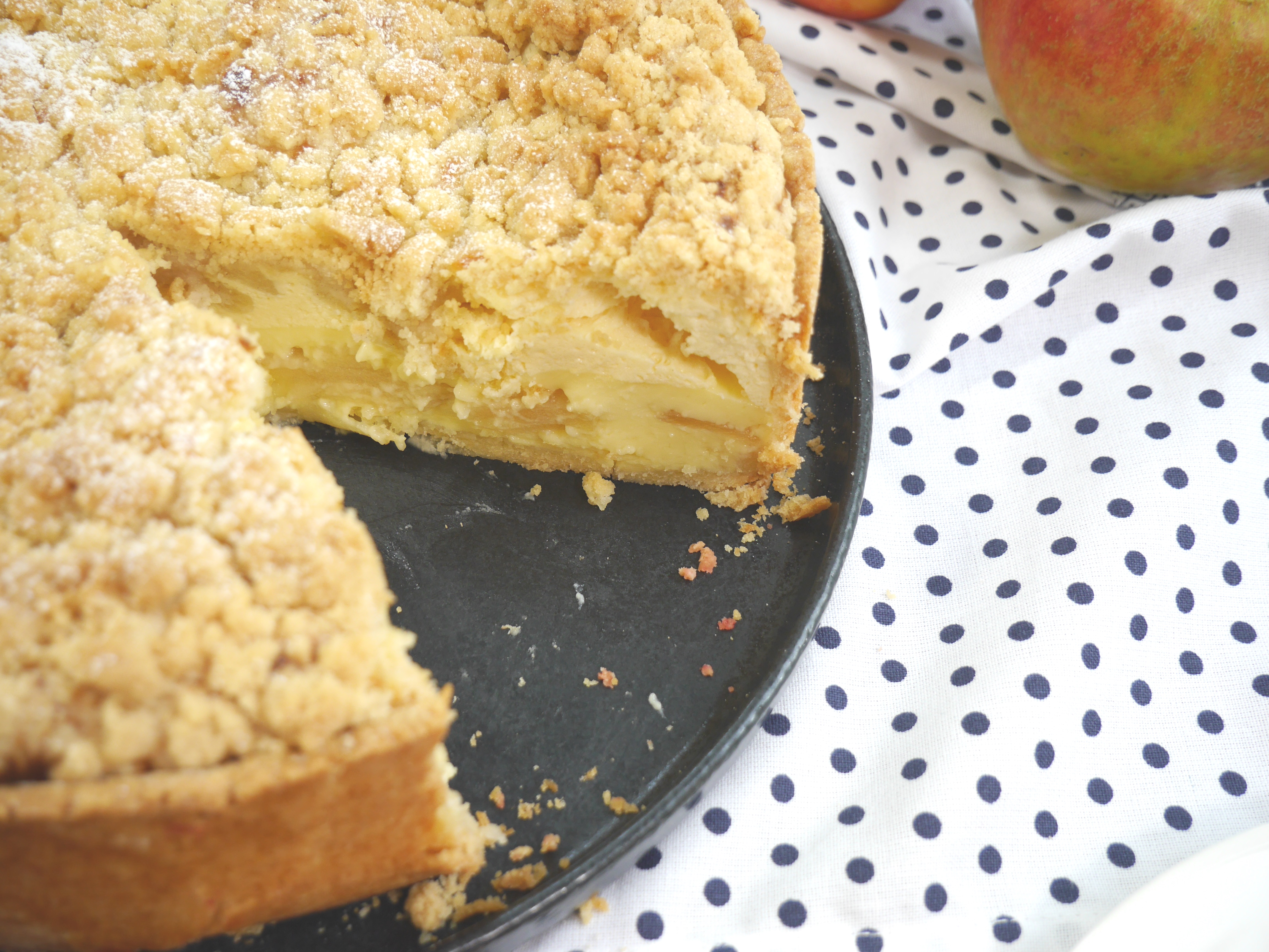 Die Hälfte des fertigen Puddings auf den Mürbeteigboden geben und mit den Apfelscheiben belegen. Den restlichen Pudding darauf verteilen.