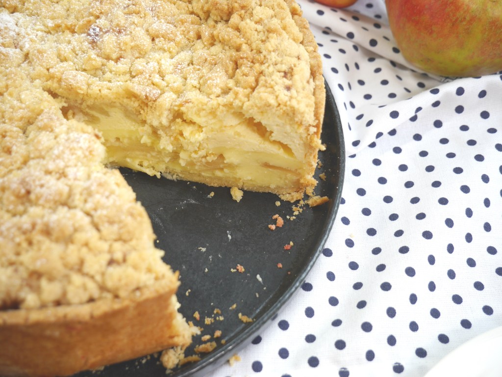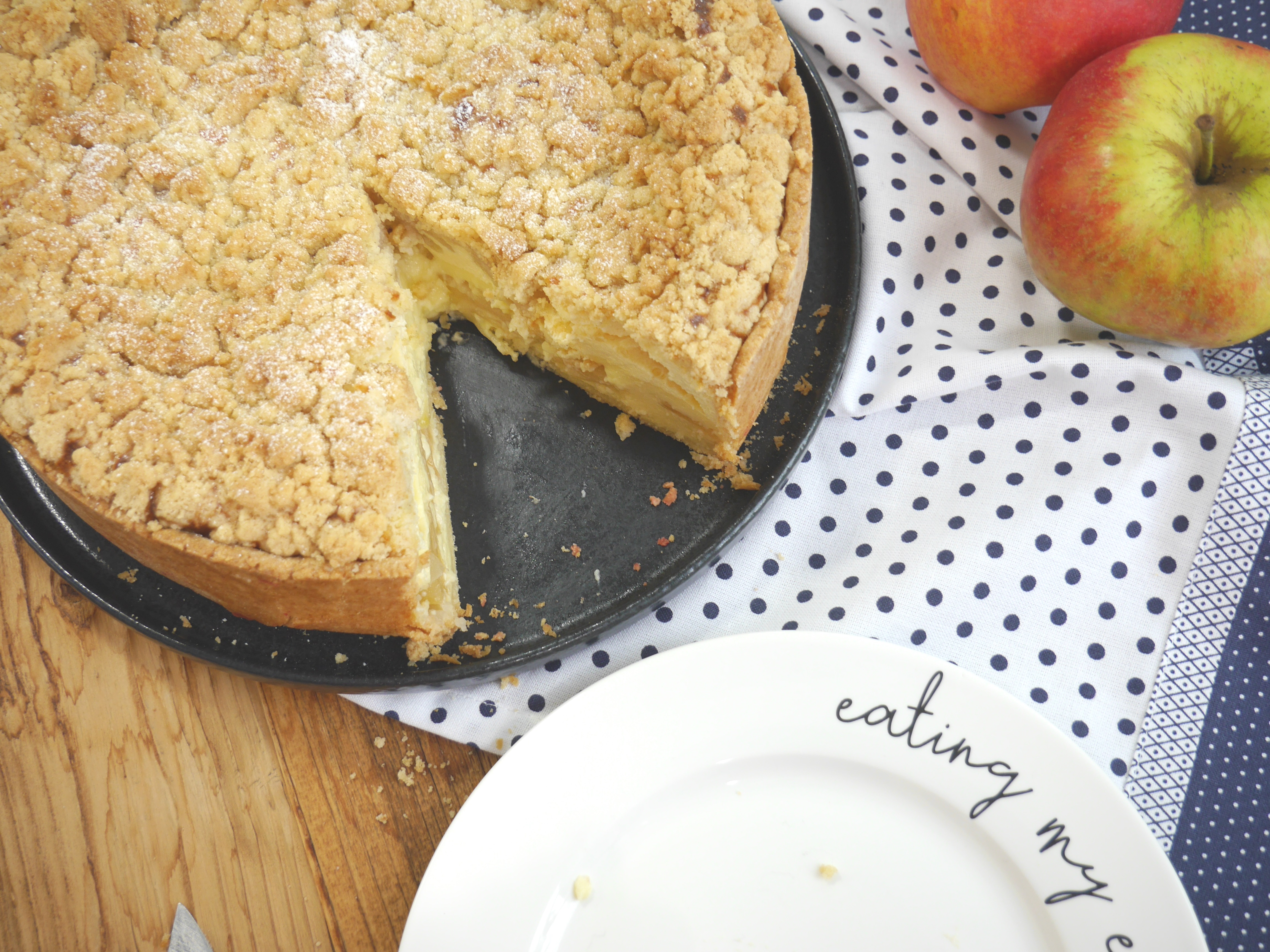 4. Für die Quarkcreme alle Zutaten in einer Schüssel verrühren und die fertige Creme auf dem Kuchen bzw. der Apfelfüllung verteilen.