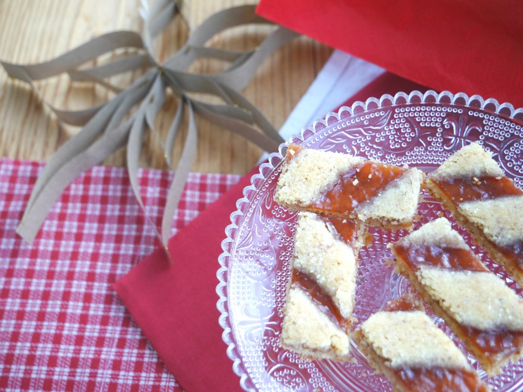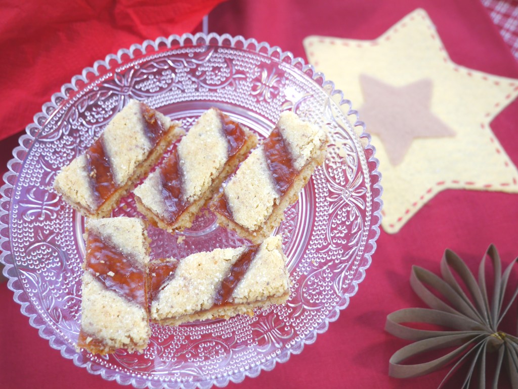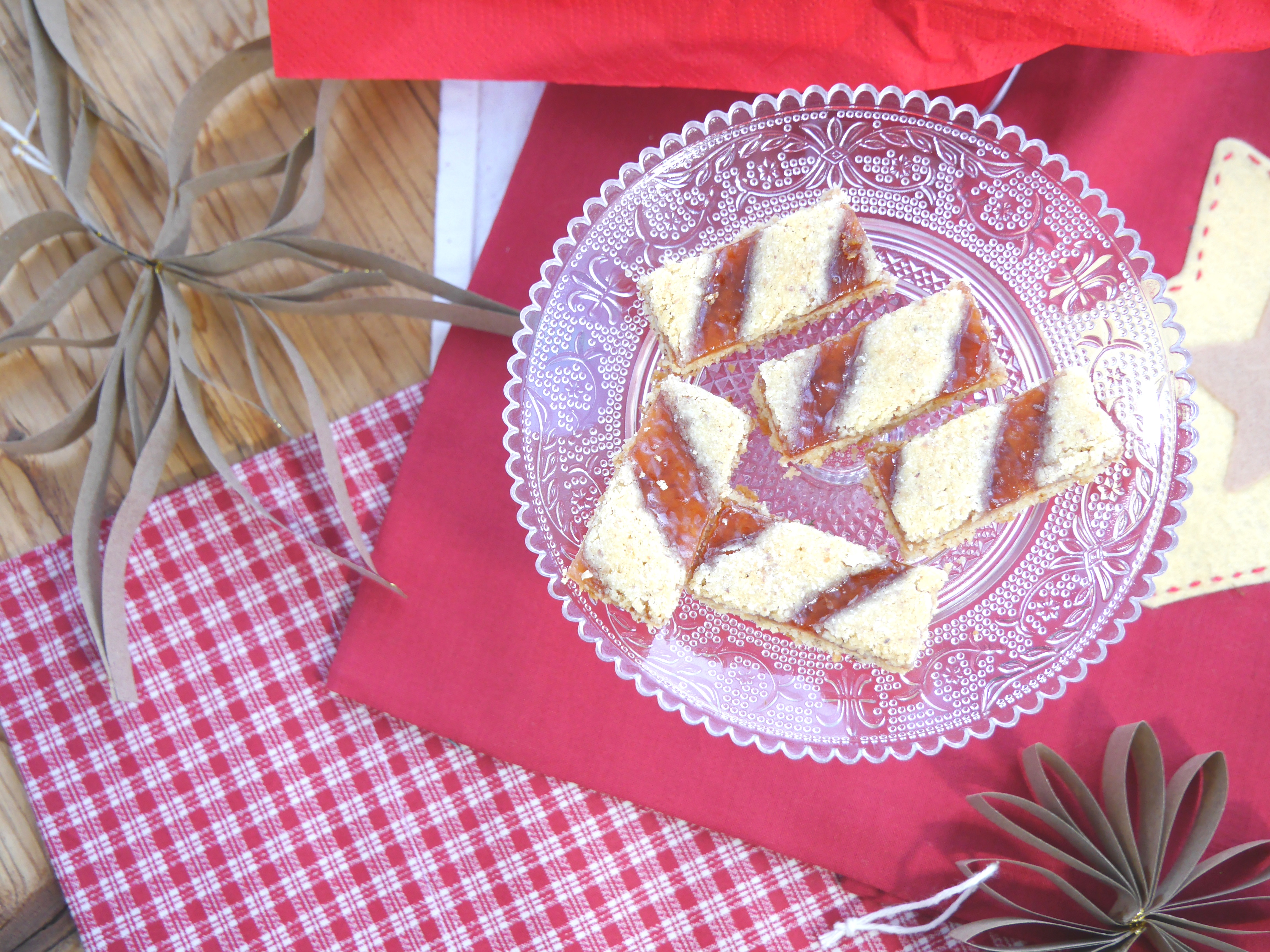 Die Streifen mit einem Abstand von 1,5 cm diagonal auf das Gelee legen und nocheinmal bei 180 Grad Ober-/Unterhitze für 20 Minuten backen. Vollständig abkühlen lassen.