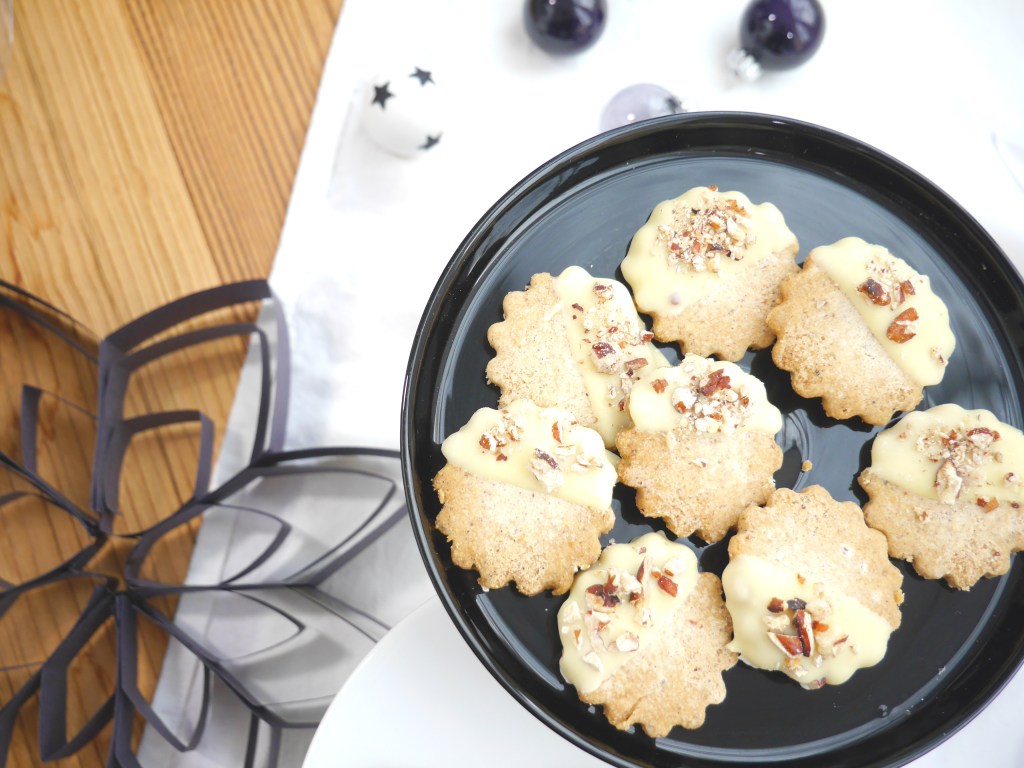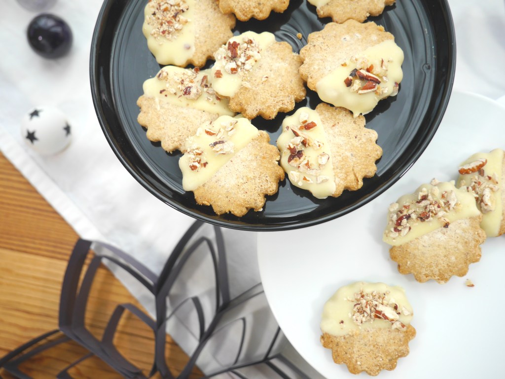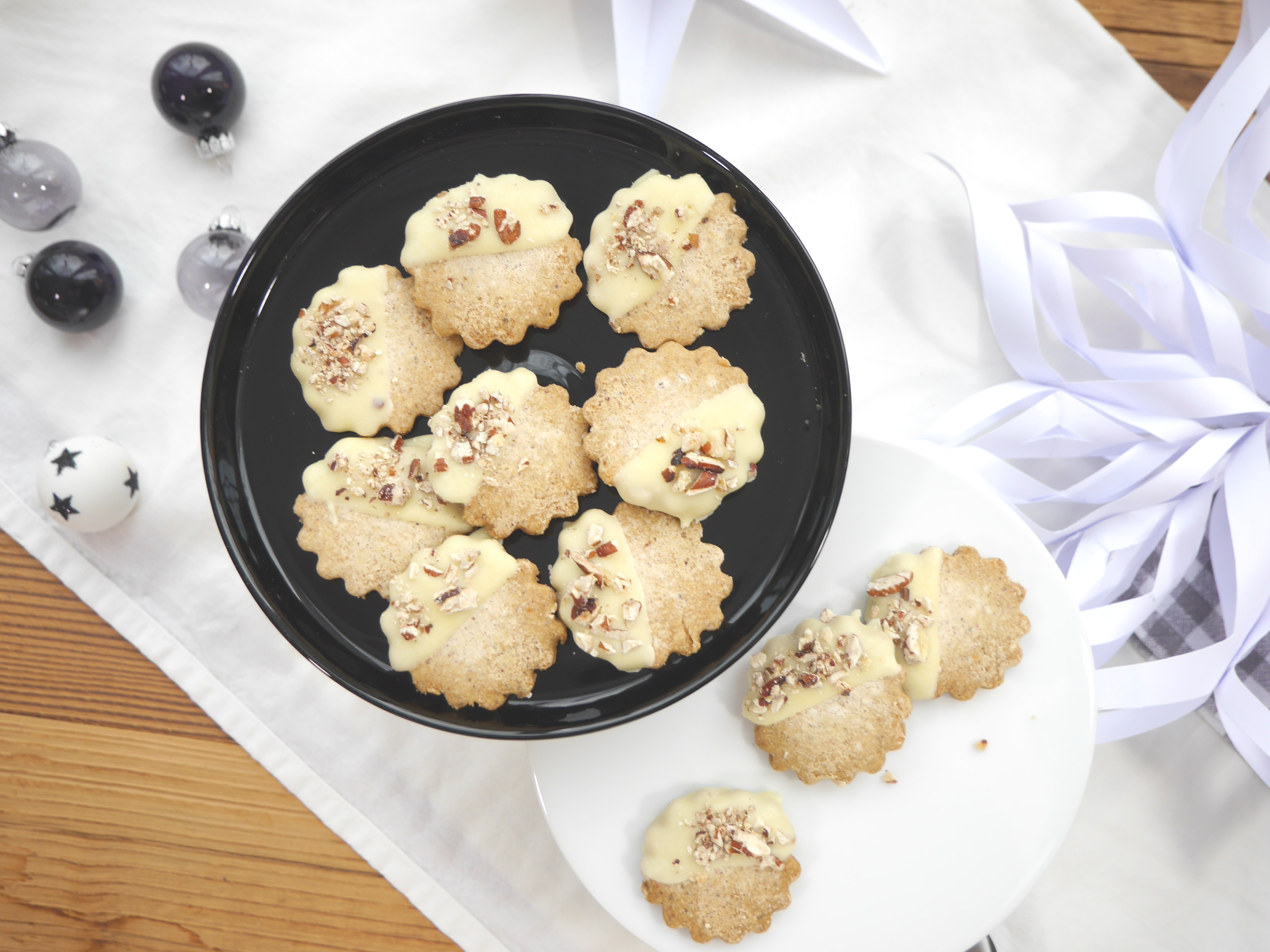 2. Für die Deko die Schokolade im Wasserbad schmelzen. Die Pecannüsse in einer Pfanne leicht anrösten und grob hacken. Abschließend jedes Plätzchen in die Schokolade tunken und mit den Nüssen bestreuen.
