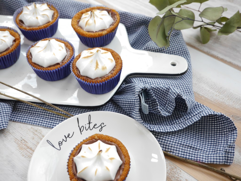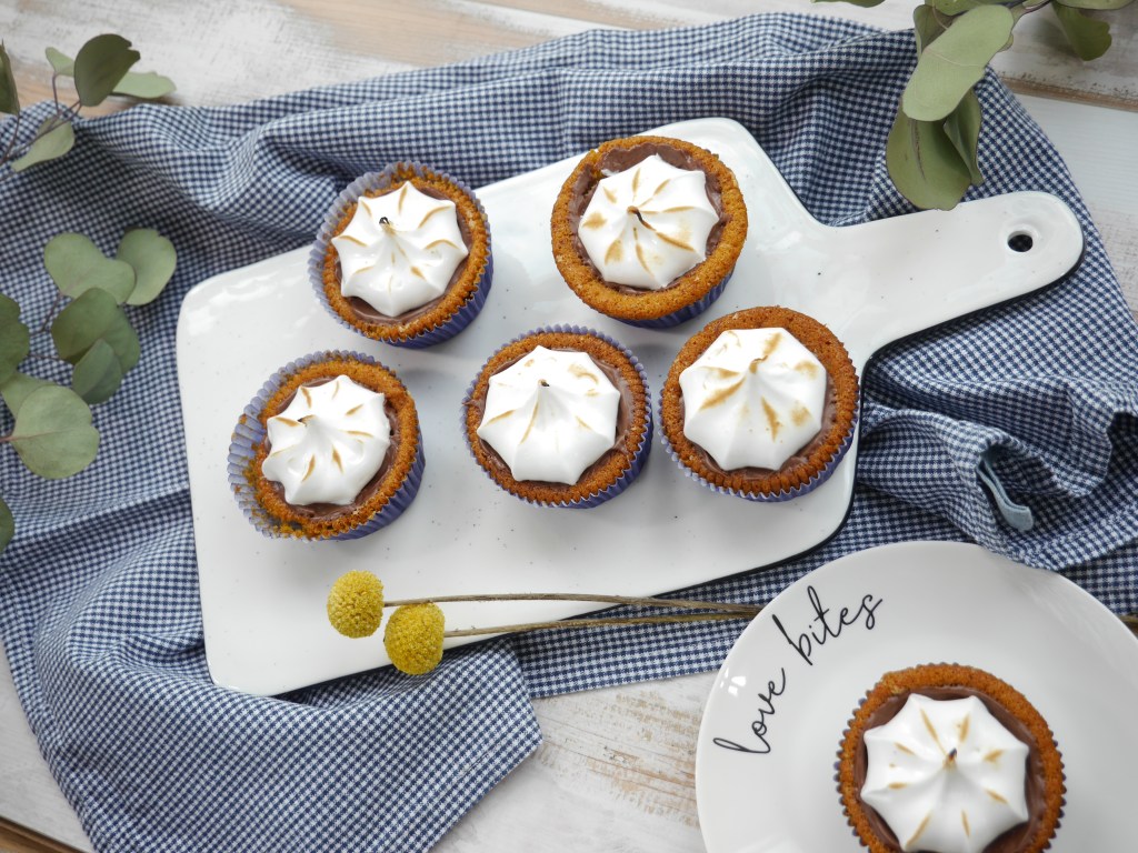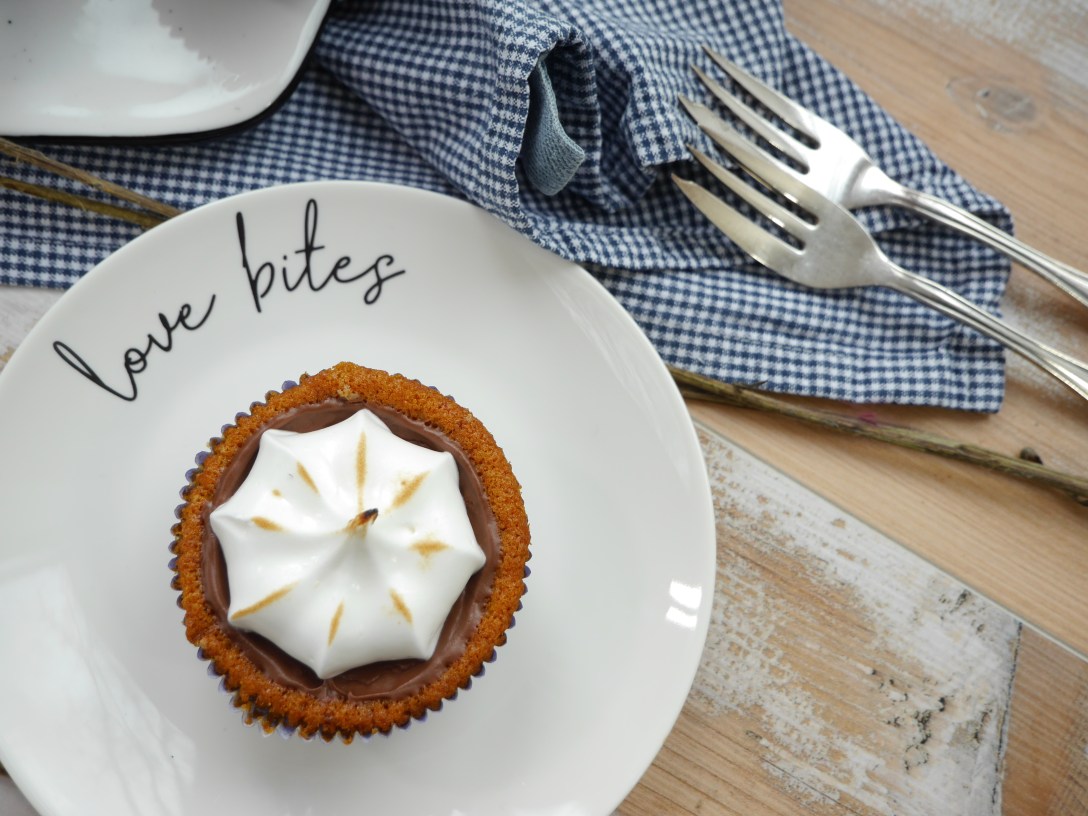 Den fertigen Eischnee in einen Spritzbeutel mit Sterntülle füllen und jeden Cupcakes mit einem Tupfer Einschnee dekorieren. Zum Schluss die Cremehaube mit einem kleinen Küchen-Gasbrenner etwas bräunen.